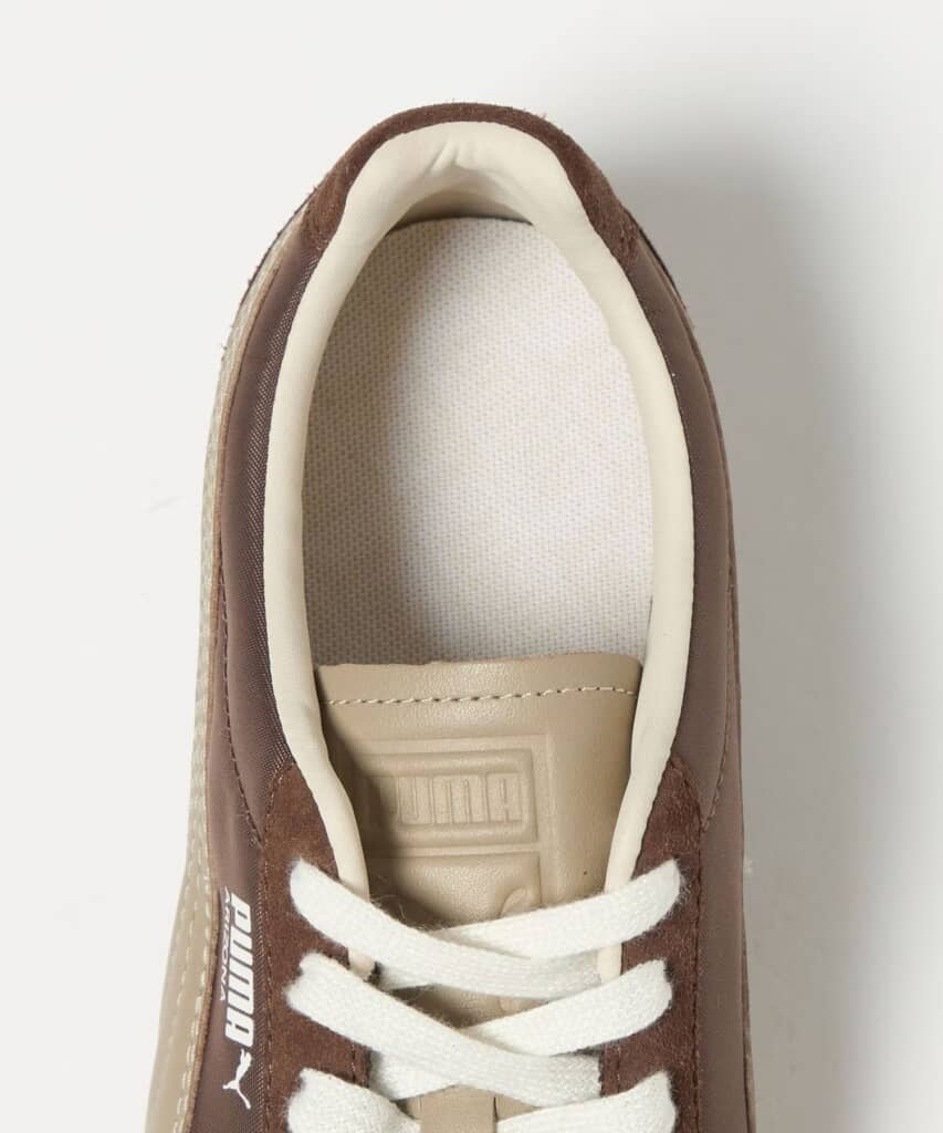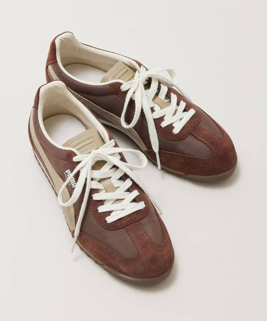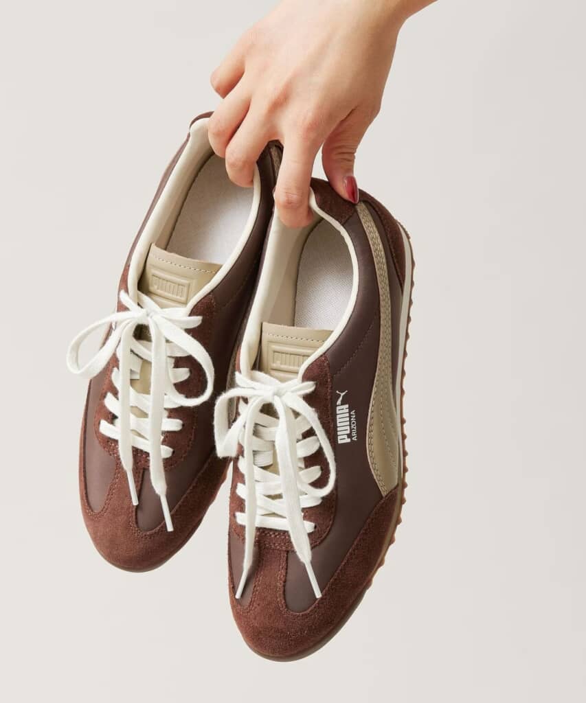 「UNITED ARROWS green label relaxing」から販売されている「【別注】<PUMA>ARIZONA スニーカー」(税込み:1万4300円)は、1970年代に誕生した名作ランニングシューズ「ARIZONA」を、グリーンレーベルらしい上品なデザインに仕上げた別注アイテム。ナイロン・スエード・スムースレザーを組み合わせたアッパーに、グレージュのフォームストライプを配することで、落ち着いた大人の雰囲気を演出しています。薄底や短めのトゥボックスなど当時のシルエットを忠実に再現しつつ、現代的な洗練さを加えた一足に仕上げているのが特徴。秋冬に合わせたいブラウンカラーも魅力的です。公式オンラインサイトで売り切れてしまっていますが、そのほかの通販サイトなどでは取り扱っている場合もあるので、チェックしてみてください。
