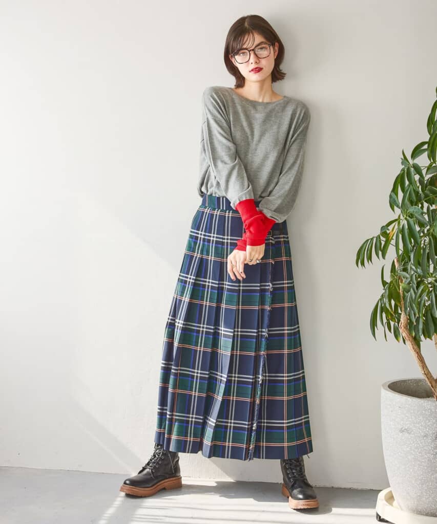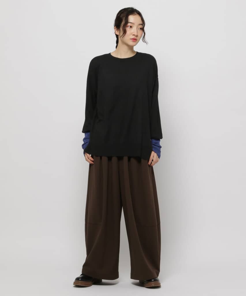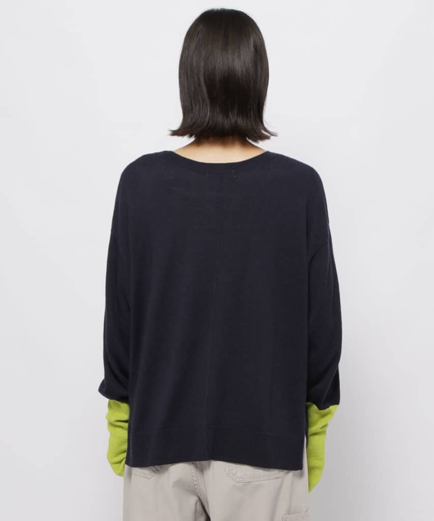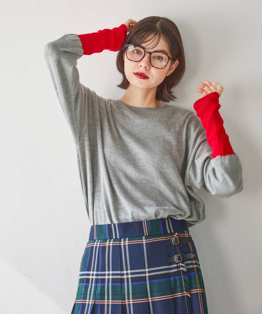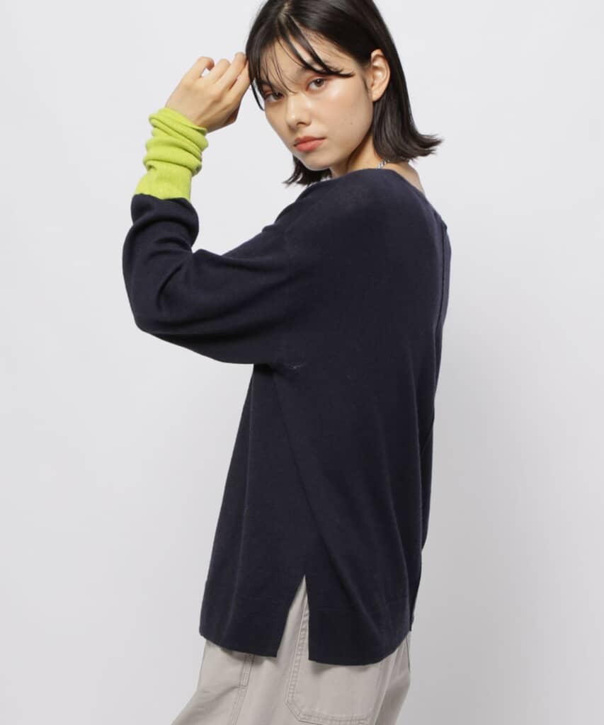 niko and …(ニコアンド)から販売されている「カシミヤ混配色ニットプルオーバー」が、袖部分の色がかわいい薄手のニットで、ぴたっとしないシルエットなので体のラインを拾わず、一枚でもインナーとしても着やすいと人気を集めています。