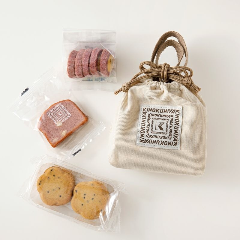 巾着の中には「紫いもとホワイトチョコのパウンドケーキ」「さつまいもクッキー」「プチフールクッキーさつまいも」の3種類の焼菓子が入っています。焼菓子を食べ終わった後も、バッグインバッグや小物入れとして活用可能。自分へのご褒美としてはもちろん、手土産や贈り物としてもぴったりです。