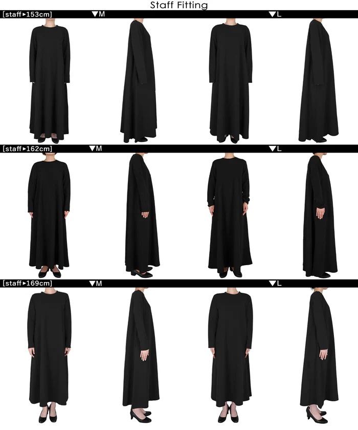 ポケット付きでカラーはグレー・チャコール・ブラック・ネイビーがそろいます。サイズはM・Lの2展開で、着丈は約125センチ。シンプルなデザインで、レギンスやデニムなどとの重ね着にも取り入れやすい1枚です。