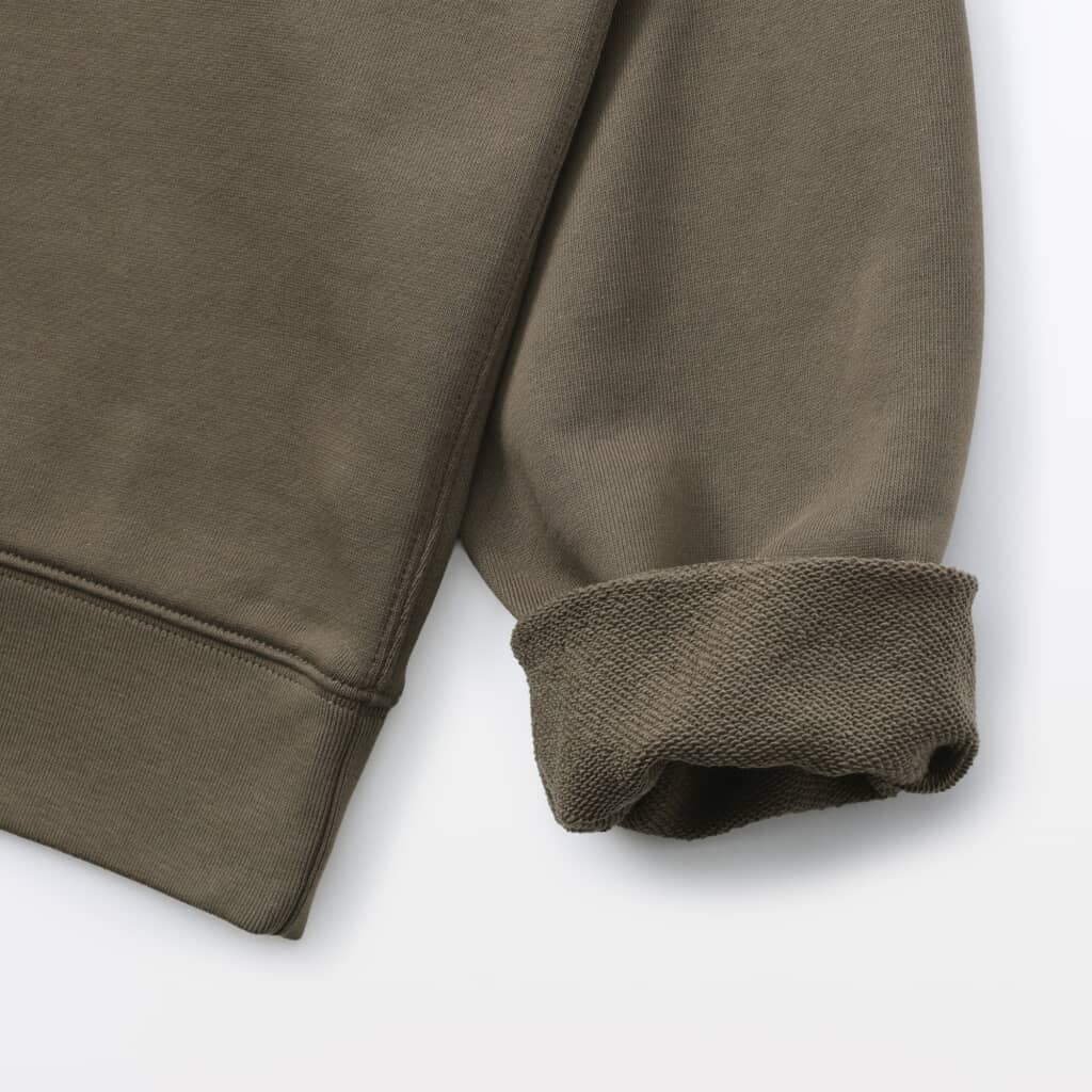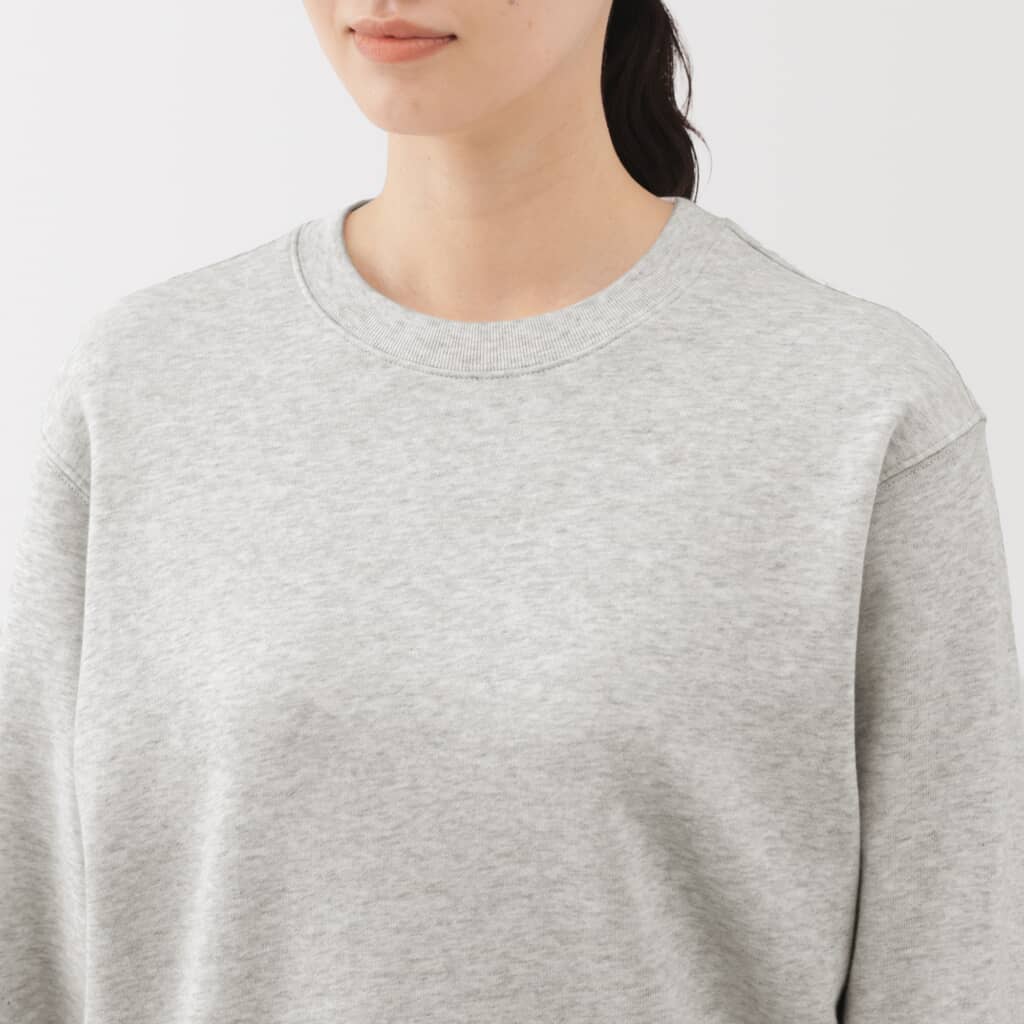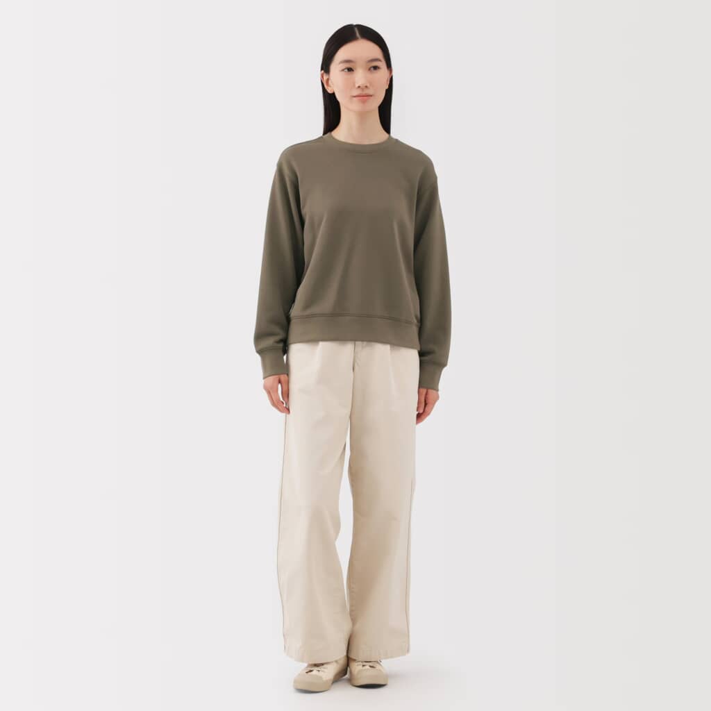 無印良品の「婦人 裏毛スウェットシャツ」(税込2990円)は、オーガニックコットンを使用した裏毛素材のスウェットです。裏側がループ状になった生地は、ほどよい厚みとやわらかな肌ざわりが特長。綿とポリエステルの混紡で、軽やかさと耐久性を両立しています。