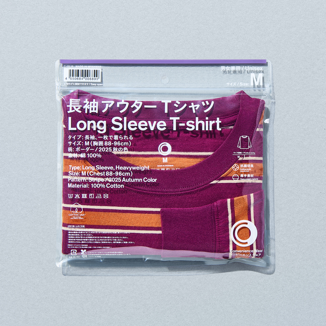 そんなコンビニエンスウェアの「長袖アウターTシャツ ボーダー/2025 秋の色」(税込1998円)は、USAコットン素材を使用し、肩の落ち感やステッチ幅など細部にまでこだわってつくられた1枚。秋らしいシーズンカラーのボーダー柄で、1枚で着てもアウターのインナーとしても活躍します。抗菌防臭加工が施されており、ニオイにくい仕様なのも魅力。全国で発売中で、サイズはM・Lの2種類です。
