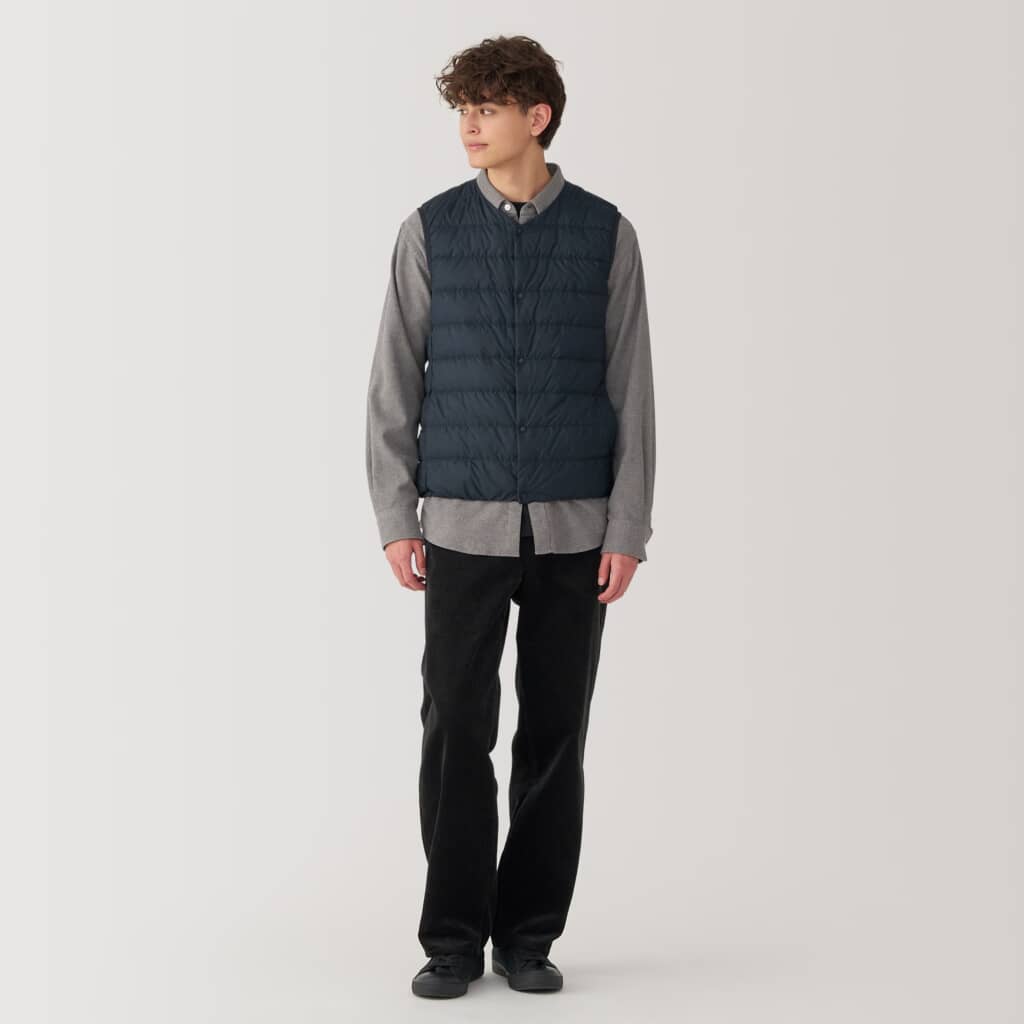 無印良品の「紳士 軽量ダウンノーカラーベスト(帯電防止裏地)」(税込3990円)は、軽さと暖かさ、そして快適な着心地を兼ね備えたダウンベストです。