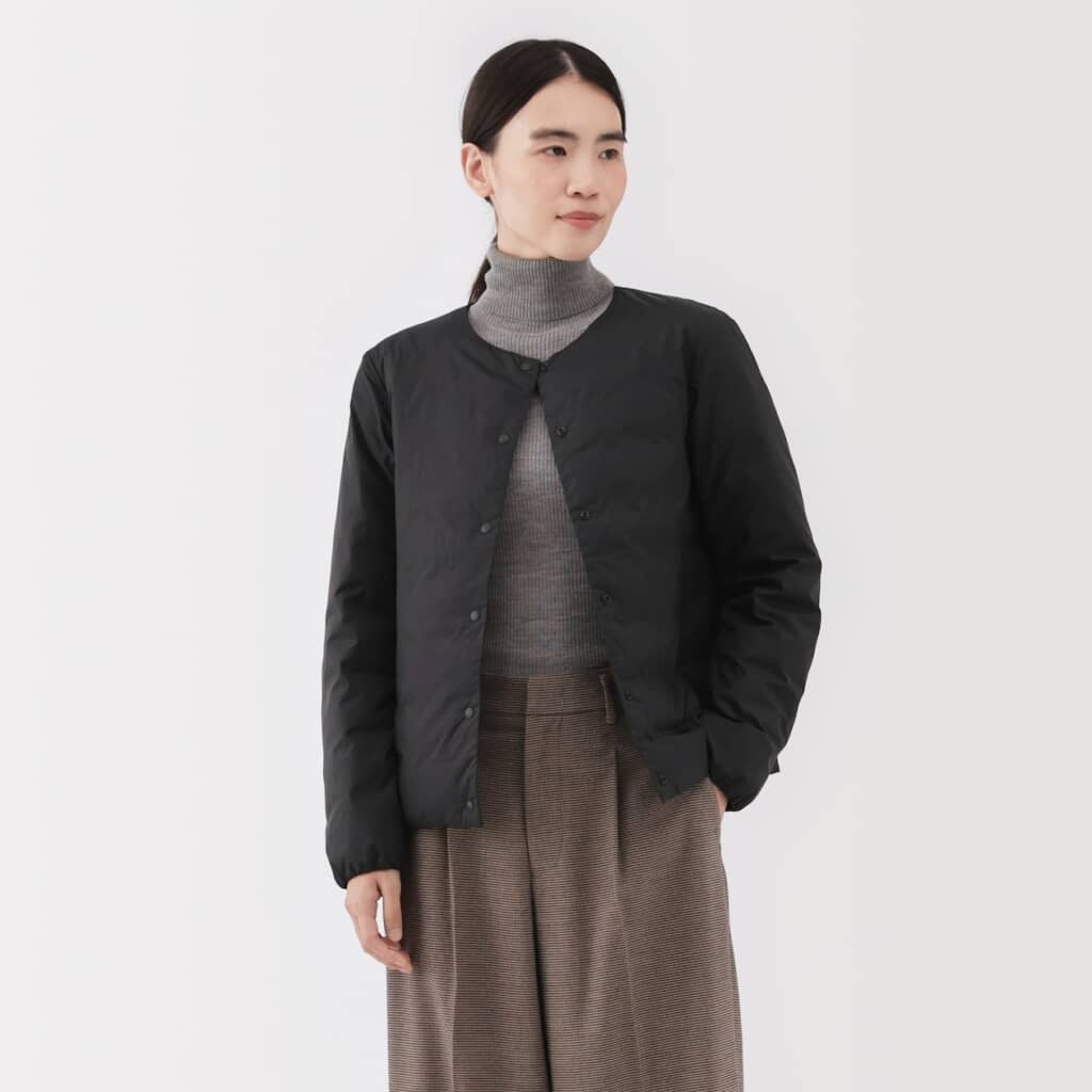 無印良品の「婦人 軽量ダウンポケッタブルノーカラージャケット」(税込み6990円)は、膨らみのある750フィルパワーの羽毛を使用したアイテム。裏地には帯電防止糸を採用しており、静電気が起きにくく快適に着用できます。マットな見た目のナイロン素材にステッチレス仕様で、カジュアルになりすぎず上品な印象を演出してくれるのも魅力。厚手ながら細めのフィット感となっており、アウターとしてはもちろん、コートなどの下に重ねてインナーダウンとしても活躍する万能な一着です。