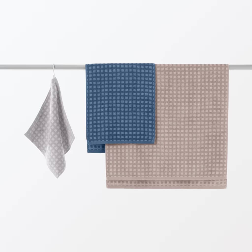 「ふっくらパイルフェイスタオル(柄)」は、長い繊維の綿を2本撚りでループにしたパイルで、弾力と強度を高めつつ、やわらかな拭き心地をかなえたシリーズです。フェイスタオルは34×85cmで、洗顔後やお風呂上がり、ヘアドライまで幅広く使える万能サイズ。洗濯を繰り返してもふっくら感が続く設計で、初期は毛羽が出やすいため洗濯時はネット使用が推奨されています。柄は落ち着いたチェックのブルー、グレー、ベージュの3種類が新商品として販売されており、税込価格は490円です。