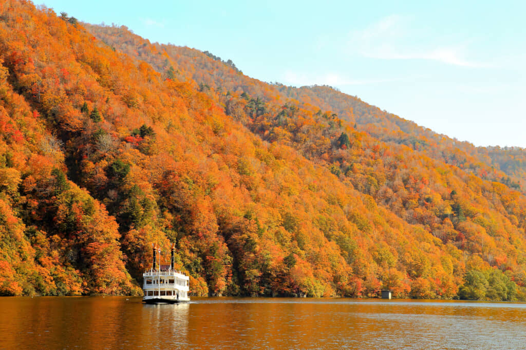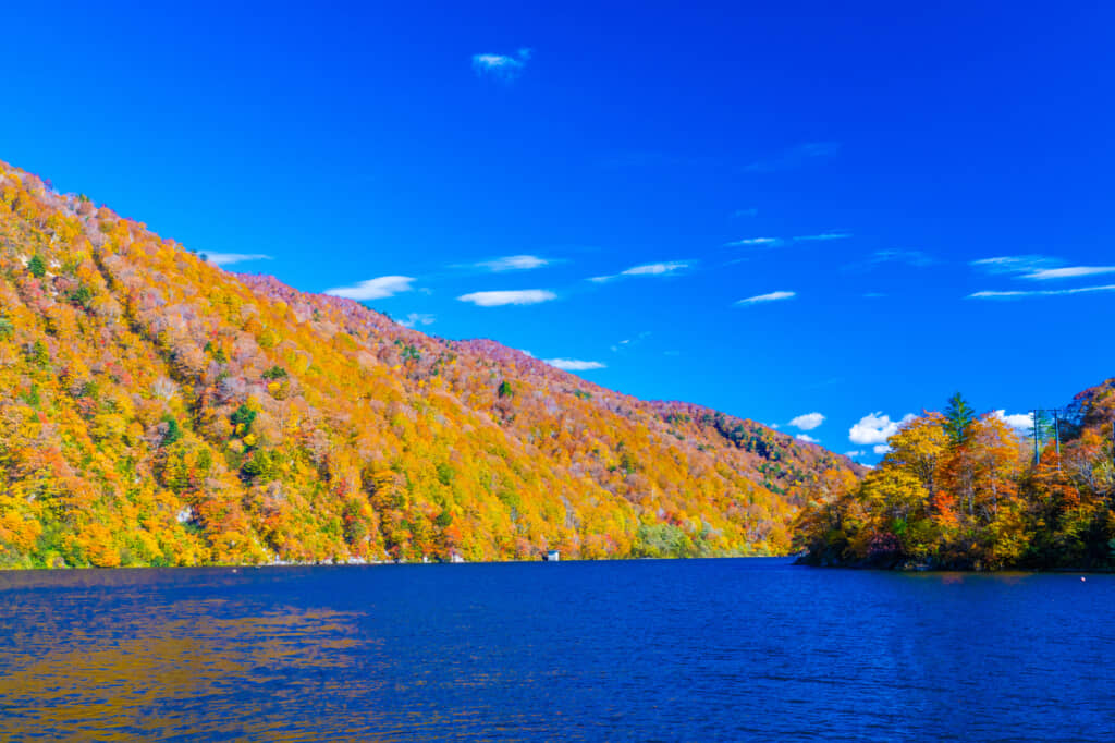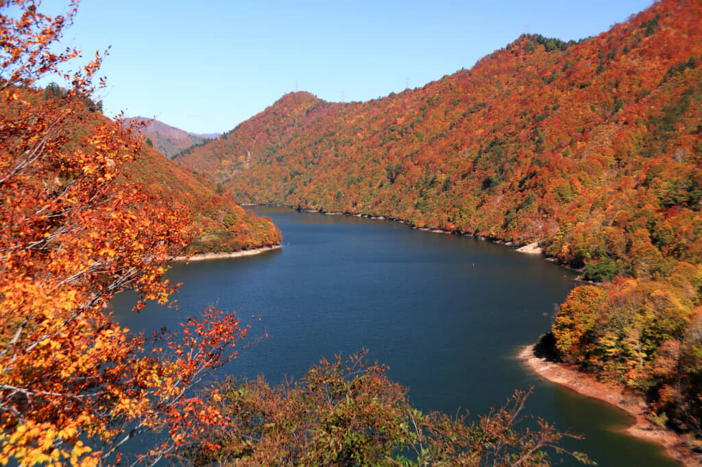 奥只見湖は、奥只見ダムにより形成された人造湖で、2,000メートル級の山々に囲まれる壮大な景観が魅力です。湖の水面に映る紅葉と山の紅葉が重なり合う様子は、「日本紅葉の名所100選」にも選ばれています。アクセスには、全長約22 キロメートルに及ぶトンネル群「奥只見シルバーライン」を通るルートが特徴的で、秘境感も味わえます。