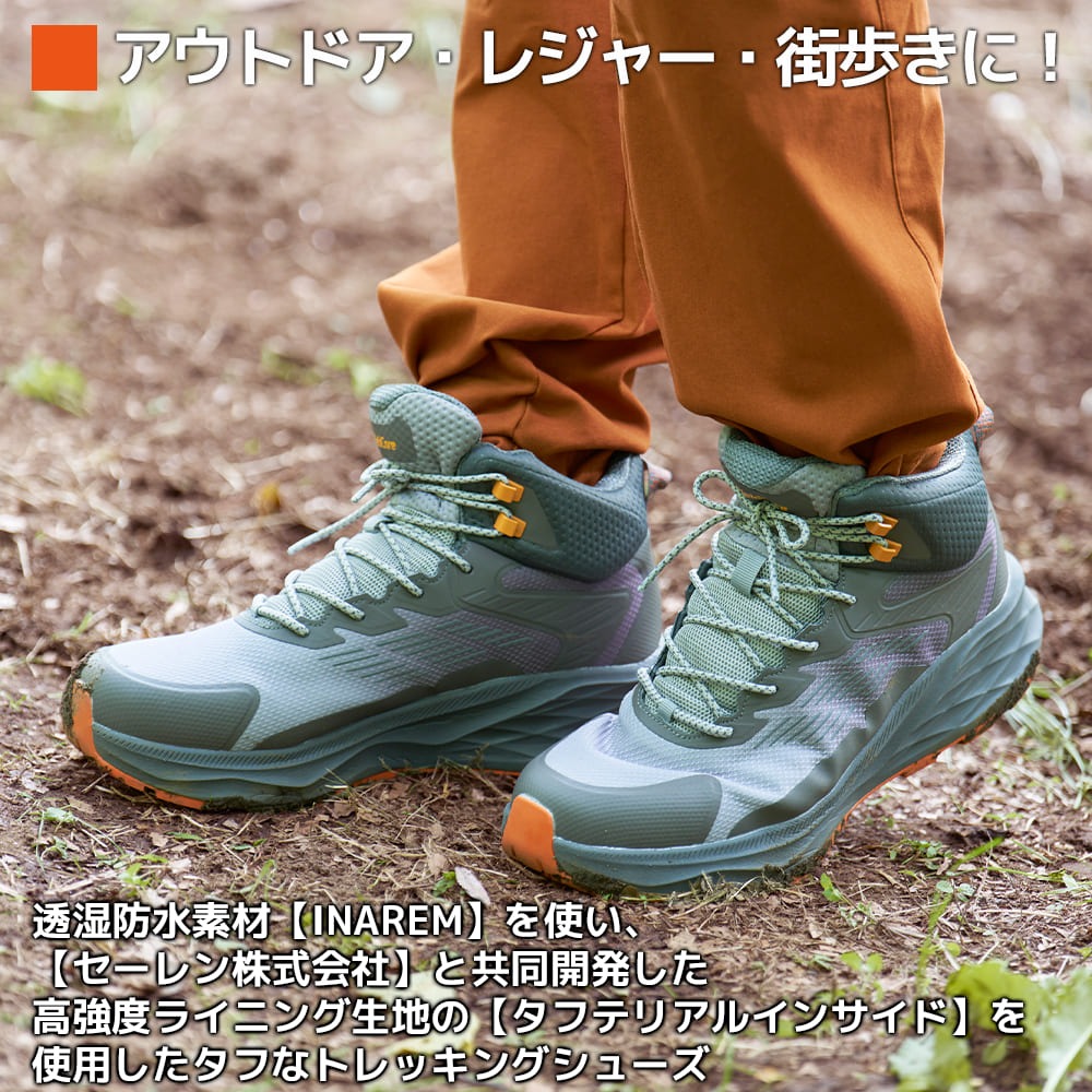 ワークマンの「トレックシューズアジム」は、透湿防水素材「INAREM(イナレム)」を使用し、セーレンと共同開発したタフなトレッキングシューズ。接地面から6センチまで防水性があり、耐久はっ水加工により泥汚れもつきにくいため、急な雨でも安心して使用できます。高強度ライニング生地「TOUGHTERIAL INSIDE(タフテリアルインサイド)」を採用し、耐摩耗性に優れているのも魅力。反射材や抗菌防臭加工なども施されており、街歩きからアウトドアシーンまで幅広く活躍してくれる一足です。カラーは4種類、価格は4500円で販売されています。