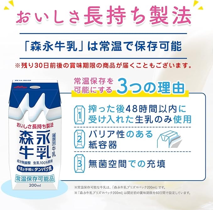「森永乳業 森永牛乳200ml×24本」は、成分無調整の生乳100%を使用した常温保存可能な牛乳です。森永乳業が独自に採用している「おいしさ長持ち製法」により、搾乳後48時間以内に受け入れた新鮮な生乳を、無菌状態で超高温瞬間殺菌。生乳そのもののコクと甘みを閉じ込め、おいしさと栄養を長期間キープできるよう仕上げられています。1本あたり200mlと飲みきりやすいサイズながら、カルシウムとたんぱく質をしっかり摂取可能。常温で保存できるため冷蔵庫のスペースを取らず、まとめ買いやストック、防災用の備蓄品としても重宝します。