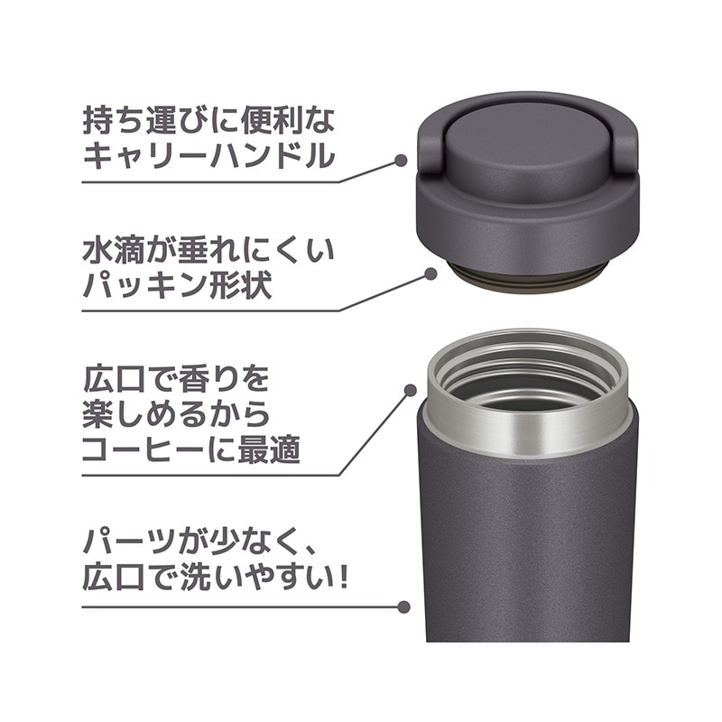 広口設計でコーヒーや紅茶の香りをしっかり感じられるほか、丸みのある飲み口がやわらかな口当たりを実現しています。真空断熱構造により、飲み頃の温度を長時間キープし、保温・保冷どちらにも対応します。パーツが少なく、全てのパーツが食洗機に対応しているため、お手入れも簡単。