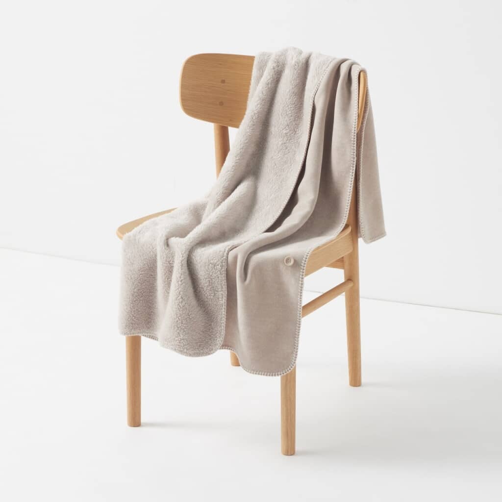無印良品の「両面使いシェニールブランケット」は、再生ポリエステルを使用したブランケット。ボタン付きなので肩に掛けたり腰に巻いたりして使えるのが便利です。表面は柔らかくなめらかなシェニール素材、裏面はふわふわで暖かなボア素材を使用。裏表で肌触りが違うため、気分や好み、状況によって使い分けられるのが便利です。洗濯ネットを使用すれば洗濯機で洗えるのも魅力。