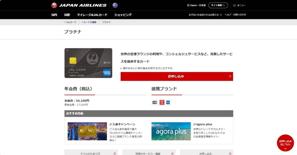 世界1700カ所以上の空港ラウンジが利用できる「プライオリティ・パス」や、必要な情報の提供や旅行のサポートなどにも利用できる「コンシェルジュサービス」など、付帯サービスも充実。また、最高1億円の海外・国内旅行傷害保険や航空便遅延保険、年間500万円の動産総合保険など、プラチナカードならではの充実した保険サービスが受けられます。2025年10月時点での年会費は5万5000円で、家族会員は無料です。