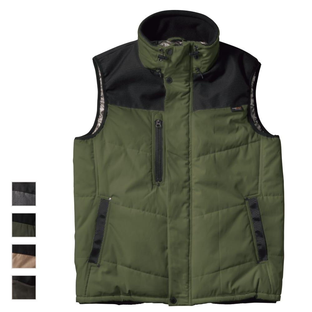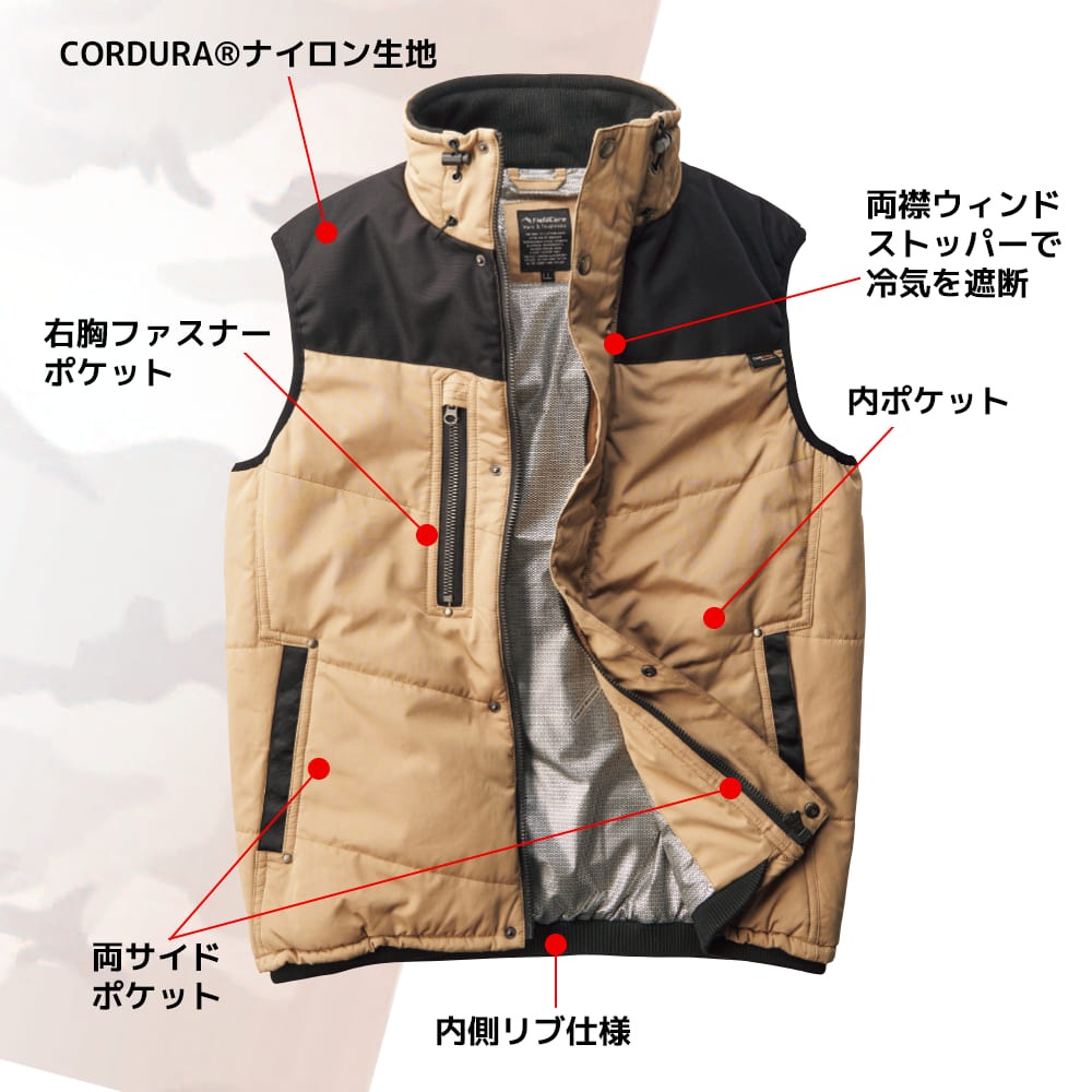 ワークマンの「裏アルミフィールドベスト」は、肩部分に耐久性に優れたCORDURAナイロンを使用し、ワークシーンはもちろん、街着としても活躍するベスト。裏地には保温性の高いアルミプリントを採用し、中わた入りでしっかり暖かさをキープします。両襟にはウィンドストッパーを備え、冷気の侵入を防止。内側は伸縮性のあるリブ仕様で着心地も快適です。右胸のファスナーポケットに加え、両サイドと内ポケット付きで収納力も抜群。機能性とデザイン性を兼ね備えたアイテムです。カラーは4種類、価格は3900円で販売されています。