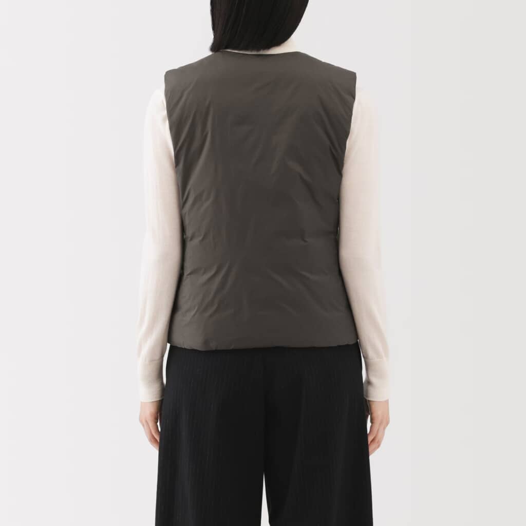 無印良品の「婦人 軽量ダウンポケッタブルノーカラーベスト」は、750フィルパワーの高品質な羽毛を使用し、優れた保温性と軽やかな着心地を実現したダウンベスト。マットな質感のナイロン素材により、カジュアルになりすぎず上品な印象を与えます。裏地には帯電防止糸を採用しており、冬場に気になる静電気を抑制。ステッチのないすっきりとしたデザインにアップデートされており、アウターとしてはもちろん、インナーとしても重ね着しやすく、幅広いスタイリングに活躍します。カラーは5種類、価格は税込み4990円で販売されています。