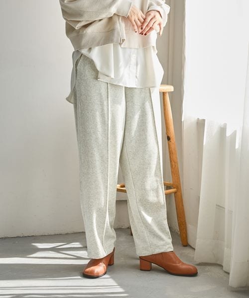 ニコアンドの「2WAYラビットベロアパンツ」は、上品な光沢とやわらかな肌触りが魅力のベロア素材を使用したイージーパンツです。リラックス感のあるイージーシルエットながら、センターにステッチを入れることで脚のラインをすっきりと見せてくれる工夫が嬉しい一品。このパンツの魅力の1つは裾のアレンジができる2WAY仕様。裾に通されたドローストリングを絞れば、スポーティな印象のスウェットパンツ風に早変わり。ゆるく履けばストレートシルエットとしても楽しめるため、コーディネートの幅がぐっと広がります。