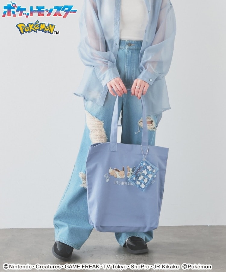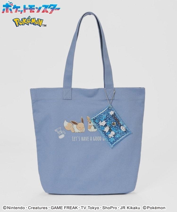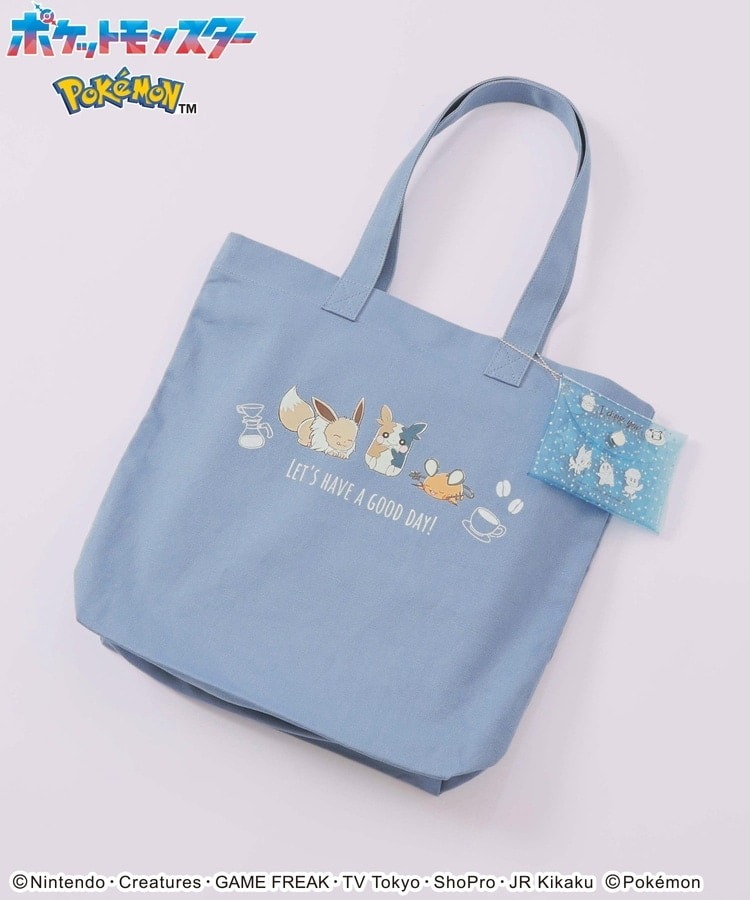 淡いブルーのキャンバス生地は綿100%で、やや厚みがありつつも軽やか。マグネット開閉式で中身が見えにくく、内側には小物を整理できるポケット付きです。さらに、ブルーのクリアポーチが付属しているのでイヤホンや小物を整理するのにも便利。サイズは縦約37センチ・横約40センチ(上部)・まち幅約10センチで、A4サイズや500ミリリットルのペットボトルもすっきり収まります。価格は税込2680円。かわいさと大人っぽさを両立した、デイリーに使いやすいポケモントートです。