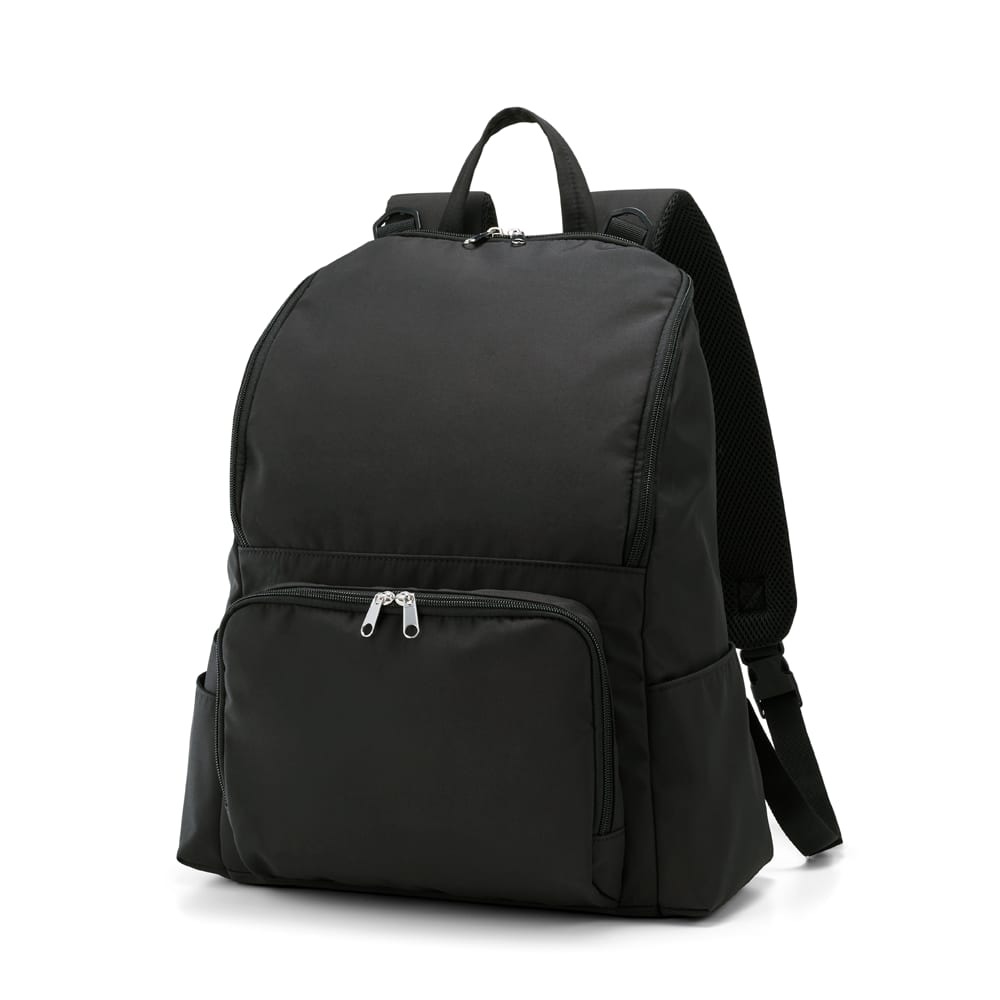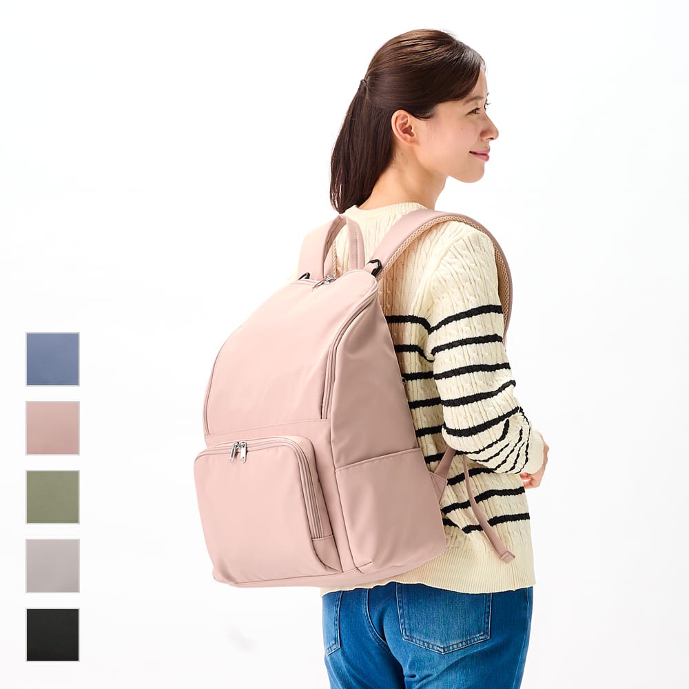 リュック本体には、使いやすさを追求した機能が満載。背面部分には通気性の良いメッシュ素材を使用し、長時間背負っても蒸れにくく快適です。さらに、生地にははっ水加工を施しており、急な雨でも中の荷物をしっかり守ってくれます。また、背面には2つのファスナーポケットを装備。ひとつはリュック内の気室に直接つながっており、財布やスマートフォンなど貴重品をサッと取り出すのに便利です。もうひとつはシークレットポケットになっていて、鍵や大切な書類などを安全に収納可能。上部にはベビーカーなどに引っかけられるDカンが付いています。フロントにはすぐに取り出したい小物を入れられるポケットを搭載。サイドにはペットボトルや水筒を入れられるポケットも付いています。