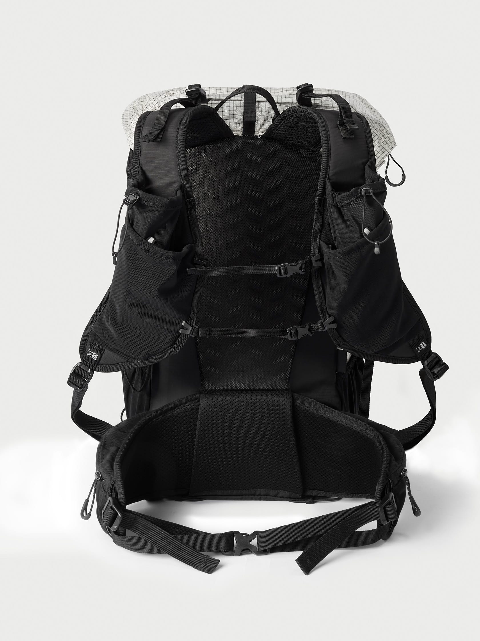 前面のメッシュポケットも小物の収納に便利。サイドポケットにはボトルを収納できる他、サイドのベルトを閉めれば長さのある物も固定できます。さらに、ストックを取り付けられるバンドも装備。底の部分にはマットの持ち運びに使えるコードが付いており、登山用リュックとしての使い勝手が抜群です。着脱式のヒップベルトを装着すれば、身体へのフィット感を高められ、より快適に行動できるでしょう。