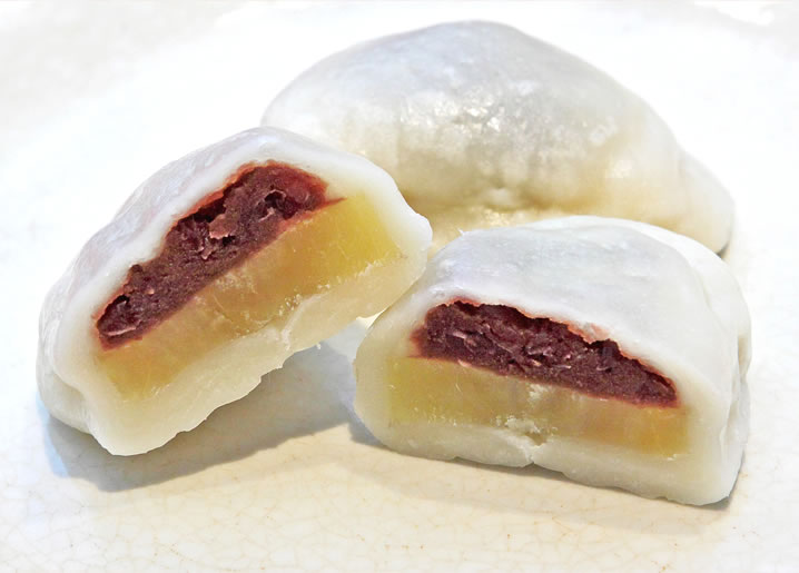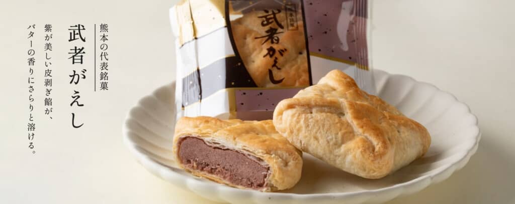 ほんのり塩味のモチモチ食感の生地とホクホクしたサツマイモ、あんこの優しい甘さが魅力。現在では生地に黒糖やヨモギを練り込んだもの、紫イモを使ったものなど、さまざまなバリエーションも登場しています。熊本土産の定番として人気の一品です。