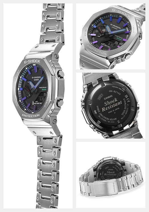 「GM-B2100PC-1AJF」は、アナログとデジタルを組み合わせたアナデジ仕様が人気のコレクション「2100」をフルメタル化したモデルです。ケース・バンドは、さびに強く耐久性に優れたステンレススチール製。チタンの焼き色のような、ブルーグラデーションのインデックスと針がアクセントになっています。ベゼルとケースの間にファインレジン製の緩衝材を入れることで、樹脂製の従来モデルと同等の耐衝撃性能を実現。20気圧防水のため、雨や日常生活の水濡れは問題なく使用できます。