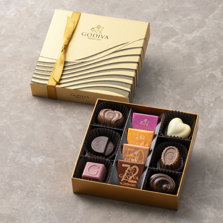 ゴディバといえば、数ある商品の中でも「ハート オブ ゴールド コレクション」が有名。香ばしいプラリネや、まろやかな口どけが楽しめるガナッシュなど、アートのように美しい見た目のチョコレートが詰められています。リボンの包装も相まって、もらうとうれしいと感じる人が多いのではないでしょうか。