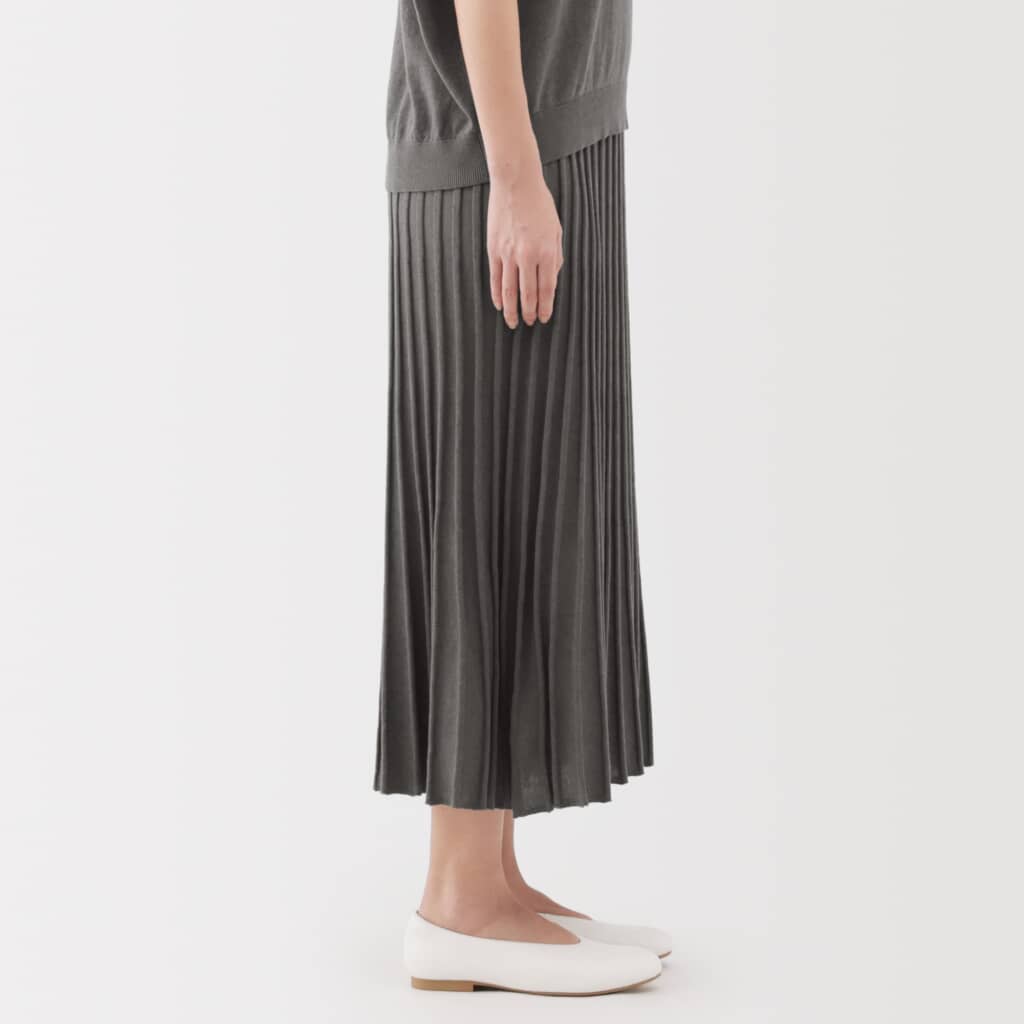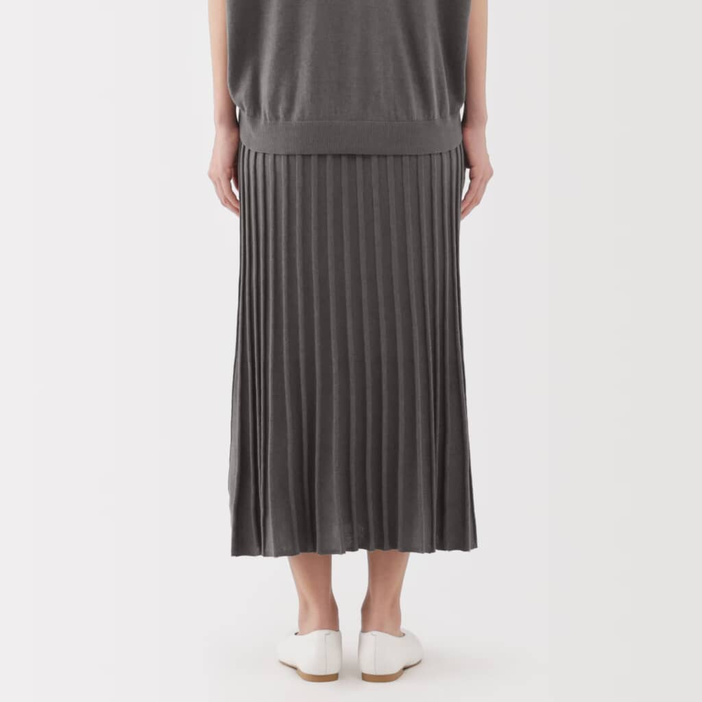 無印良品から販売されている「婦人 なめらかニットフレアスカート」が、多すぎないプリーツときれいなシルエットで細見えすると高評価を集めています。