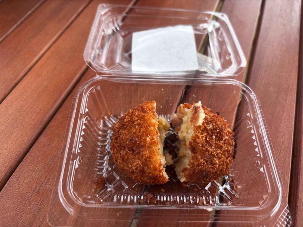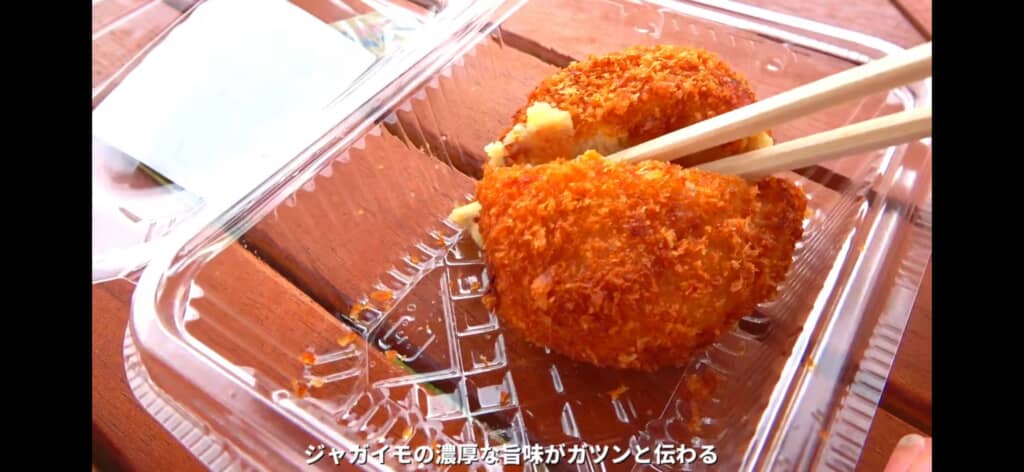 こちらのコロッケは道の駅内の「峠のコロッケ」で販売されているもの。日本有数のジャガイモ産地である飯盛町産のジャガイモをふんだんに使用し、外はサクサク、中はホクホクの食感に仕上げられています。その人気は絶大で、多くの人がこのコロッケを求め、行列ができていました。中には10個単位で購入している人もいました。