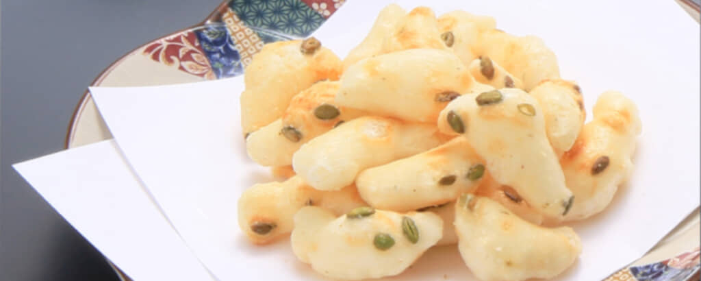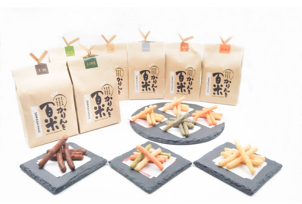 米シスト庄内が手掛ける「かりんと百米」は、米粉に自社生産の庄内米を100%使用したグルテンフリーのかりんとう。米油を使用して揚げており、小麦粉を使用していないのも大きな特徴です。黒糖・白糖・胡麻・庄内青きな粉・海老塩・ピーナツ・庄内野菜の7種類の味をラインアップしており、米袋をモチーフとしたクラフト袋のパッケージからも、こだわりが感じられます。
