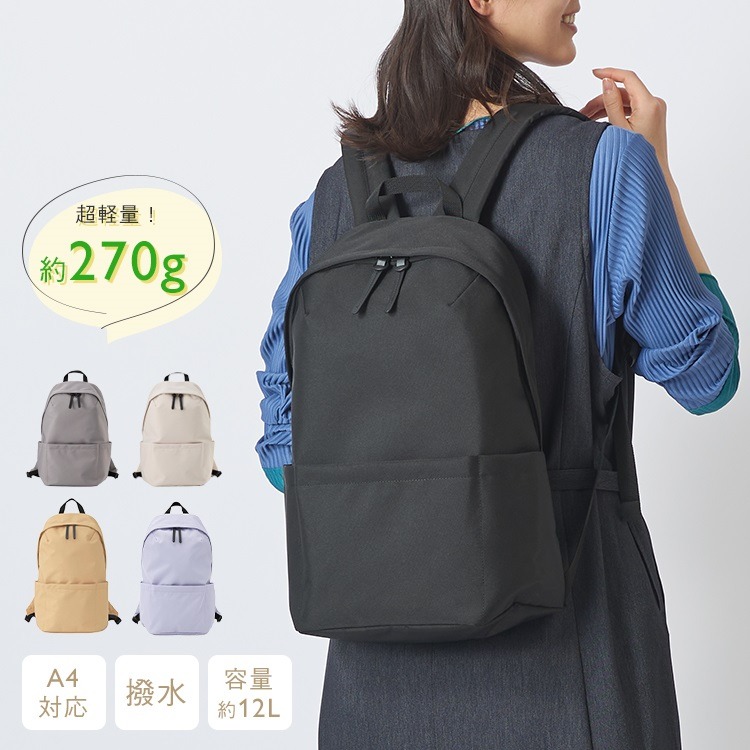 そんな中から「N撥水ライトシェルリュック M」(税込3300円)を見ていきましょう。ミニマルな雰囲気のデザインで、水を弾くポリエステルシェル製のリュック。幅約28×奥行約16×高さ約41cmとスリムながらA4ファイルが縦に入り、容量は約12リットルです。重さは500ミリペットボトルより軽い約270グラムですが、耐荷重は9キロと頼もしい設計です。