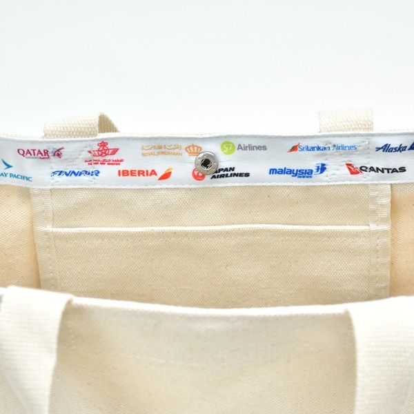 そんなJALの「JALオリジナル ONEWORLDトートバッグ 底板付き」は、国際航空連合「ワンワールド アライアンス」のロゴをさりげなくあしらった小型サイズのエコバッグ。正面にはワンワールドの丸いロゴを配置し、持つ人やファッションを選ばないシンプルで上品な印象に。開口部の内側に施されたプリントテープがポイントで、ワンワールド加盟航空会社のロゴがずらりと並び、旅好きの心をくすぐるディテールに仕上がっています。