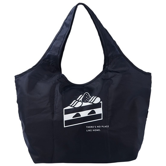 シャトレーゼの「エコバッグ」は、デザイン性と実用性を兼ね備えたアイテム。ブラックの生地にホワイトで描かれたショートケーキのイラストが印象的で、ちょっぴりレトロでキュートな雰囲気。そこに添えられた「THERE’S NO PLACE LIKE HOME.」というメッセージが、ほっとする温かみを演出しています。サイズは約16Lという大容量で、スーパーでのまとめ買いやお土産の持ち運びにも十分です。素材は撥水加工が施されており、突然の雨でも中身がぬれにくく安心。軽量なので、持ち歩きの負担にならず、バッグに入れておいても邪魔になりません。