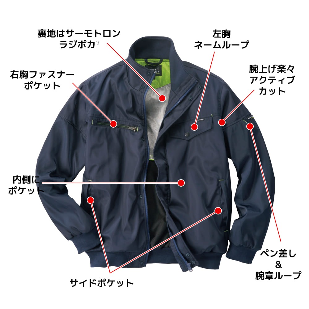 「蓄熱ダブルウォーム ライトブルゾン」(品番WM3694)は、裏地にユニチカの機能素材「サーモトロン ラジポカ」を採用した秋冬向けの防寒ブルゾンです。太陽光などの光を熱エネルギーに変換しつつ、遠赤外線を放射することで、ジャケット内をあたたかく保つ仕様になっています。腕上げがラクなアクティブカットと、軽量で快適な着心地が特徴で、長時間の作業や移動でもストレスを感じにくいのがうれしいところ。