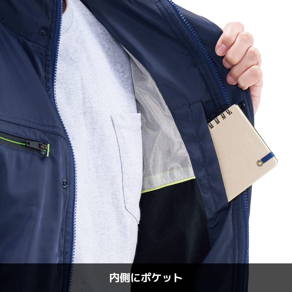 右胸のファスナーポケットに加え、両サイドと左内側にもポケットを備え、小物の収納性も十分です。左胸のネームループやペン差し&腕章ループなど、現場で便利なディテールも充実。表地・裏地はポリエステル100%、メッシュ部分はポリエステル61%・複合繊維(ポリエステル)39%、リブ部分はポリエステル95%・ポリウレタン5%で、サイズはM〜4L、カラーはグレー・ネイビー・ブラックの3色展開。価格は税込2900円です。