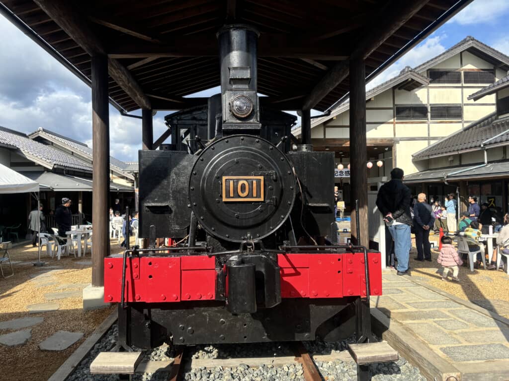 道の駅の中庭の中央には近くを走った長門鉄道の蒸気機関車(SL)が展示され、存在感が抜群です。その周りを囲むように直売所、お食事処、温泉施設があるのが他ではお目にかかれない空間を作っている道の駅と感じました。ちなみにSLの近くにはどこでもドアを彷彿とさせるドアもあってこれは理由が不明とのことでした。
