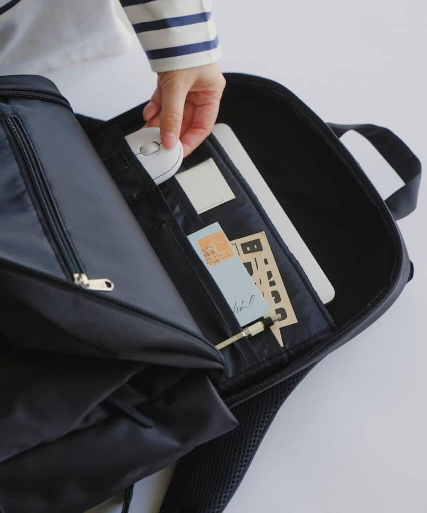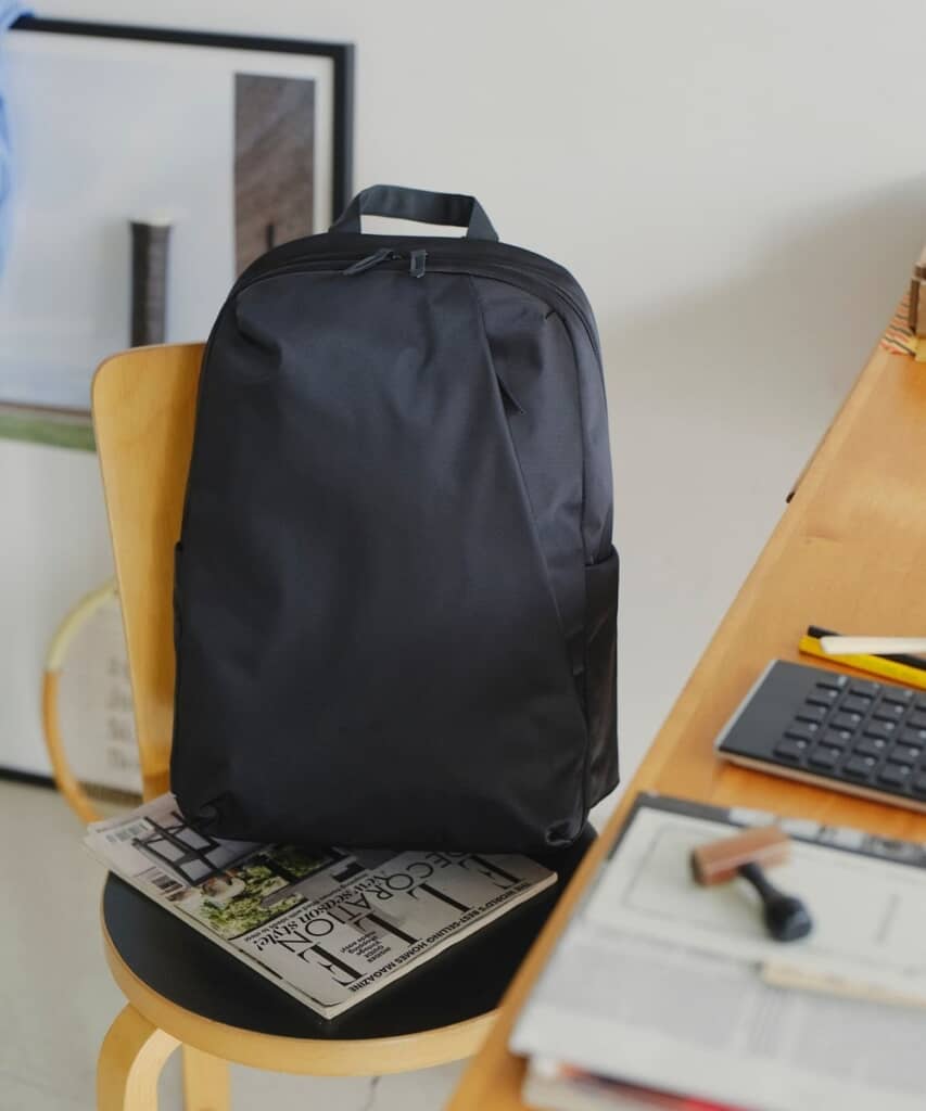 Mサイズは16インチまでのPCが収納可能で、見た目のコンパクトさに反して収納力をしっかり確保。容量はスタンダードモデルより3L増えた18Lになり、PC・ノート・手帳・ポーチなど、日常の必需品を無理なくまとめられるのがうれしいポイントです。内部のPC収納スペースには小分けポケットが追加され、マウスやコード類などの整理もしやすいのだとか。両サイドの伸縮ポケットはペットボトルや折りたたみ傘をサッと差し込める仕様で、外出先での使い勝手をさらに向上。小雨程度なら対応できるはっ水仕様、開閉しやすいダブルファスナー、多数のポケットなど、使いやすさを支える工夫が随所にちりばめられています。