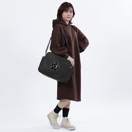 MARY QUANT(マリークワント)の「ピンソニックキルトデイジー ライトボストン」は、軽量で機能的なボストンバッグ。ブランドアイコンの大きなデイジーパッチがアクセントで、内外に複数のポケットを備えています。