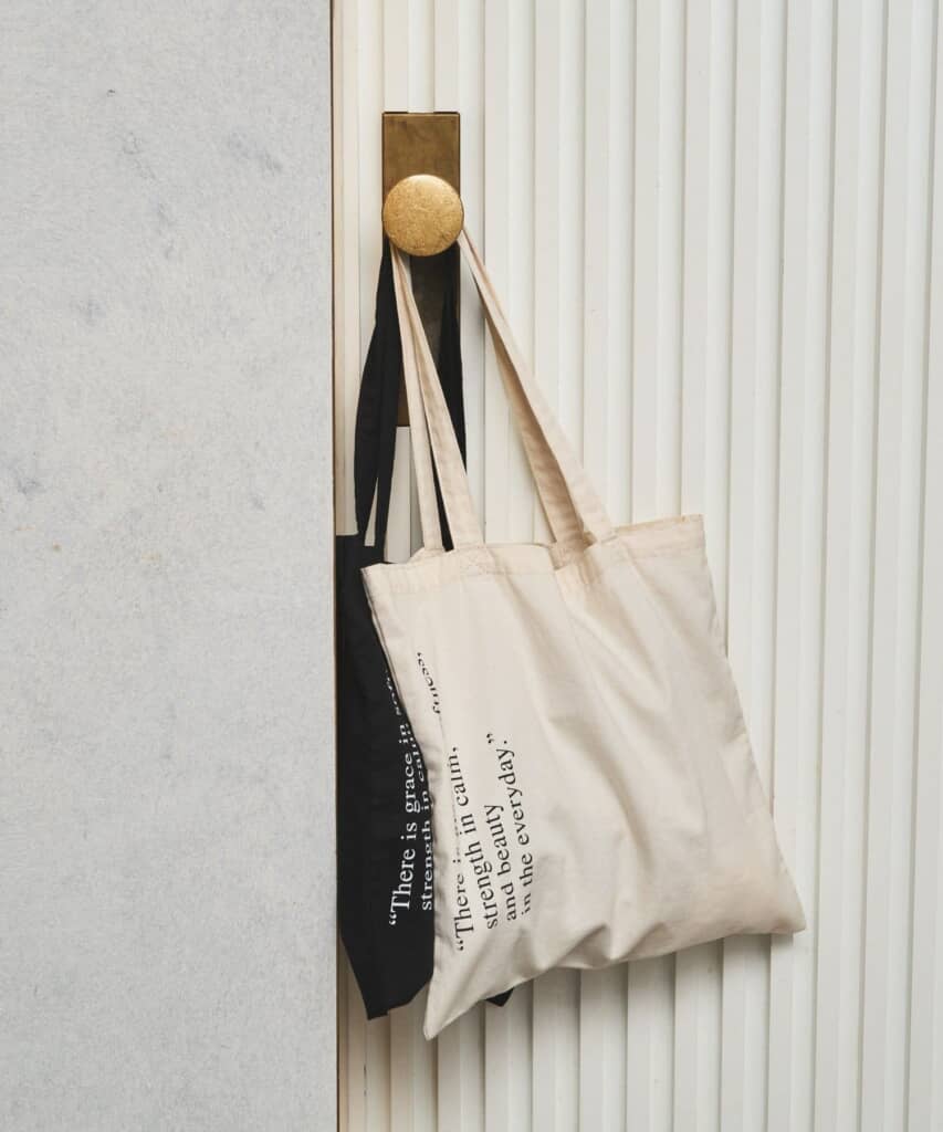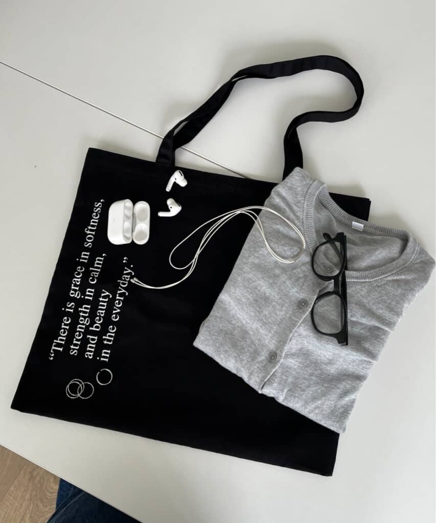サイズは高さ約36cm、幅約40cmの横長シルエットで、A4サイズの書類もしっかり収まります。マチは薄めで、持ち手は約61.5cmと長めに設定されているため、肩掛けしやすいバランスです。最大の特徴は、左端にすっと入った英字メッセージロゴが静かに主張してくれて、シンプルなコーデも一気にこなれた印象に。素材はごわつきにくい柔らかな綿で、軽くてかさばりにくく、バッグ自体を折りたたんで内装ポケットにしまえるポケッタブル仕様になっています。メインバッグとしてはもちろん、通勤時のサブバッグやエコバッグとしても活躍。ユニセックス仕様なので、パートナーとシェアして使うのもおすすめです。