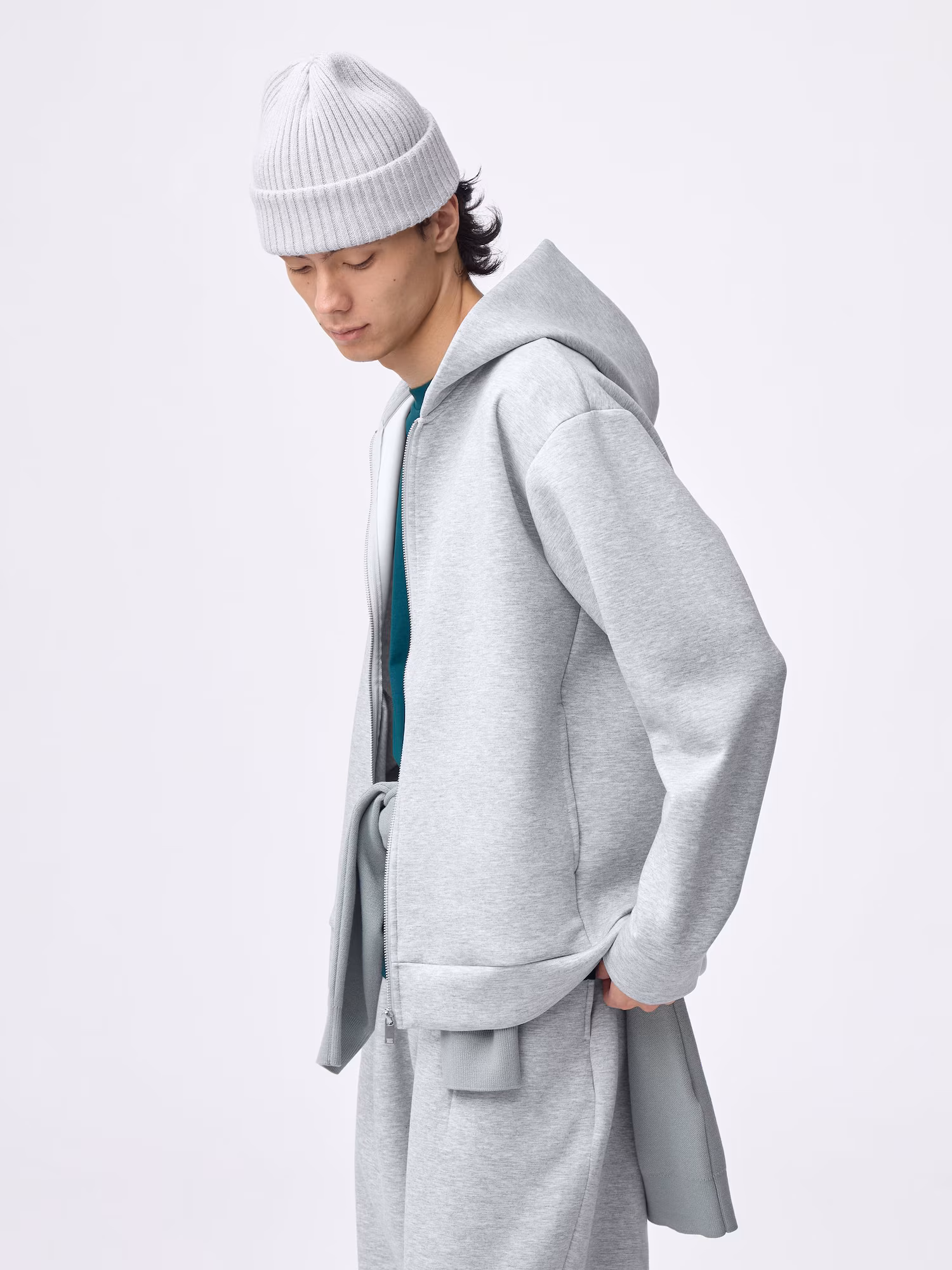 GUの「パフスウェットフルジップパーカ」は、清潔感とハリのあるダブルフェイス素材を採用したパーカー。フードは生地の特性をいかすことで、立体的に立ち上がるようになっています。カラーは薄い「GRAY」と濃いめの「GRAY」に「BLACK」と「NAVY」の4種類。いずれも落ち着いた色合いかつクリーンな印象で、スウェット素材ながらスラックスなどのボトムスと合わせたきれいめのコーディネートも様になります。羽織りからインナーまで、季節を問わず幅広いシーンで活躍するでしょう。