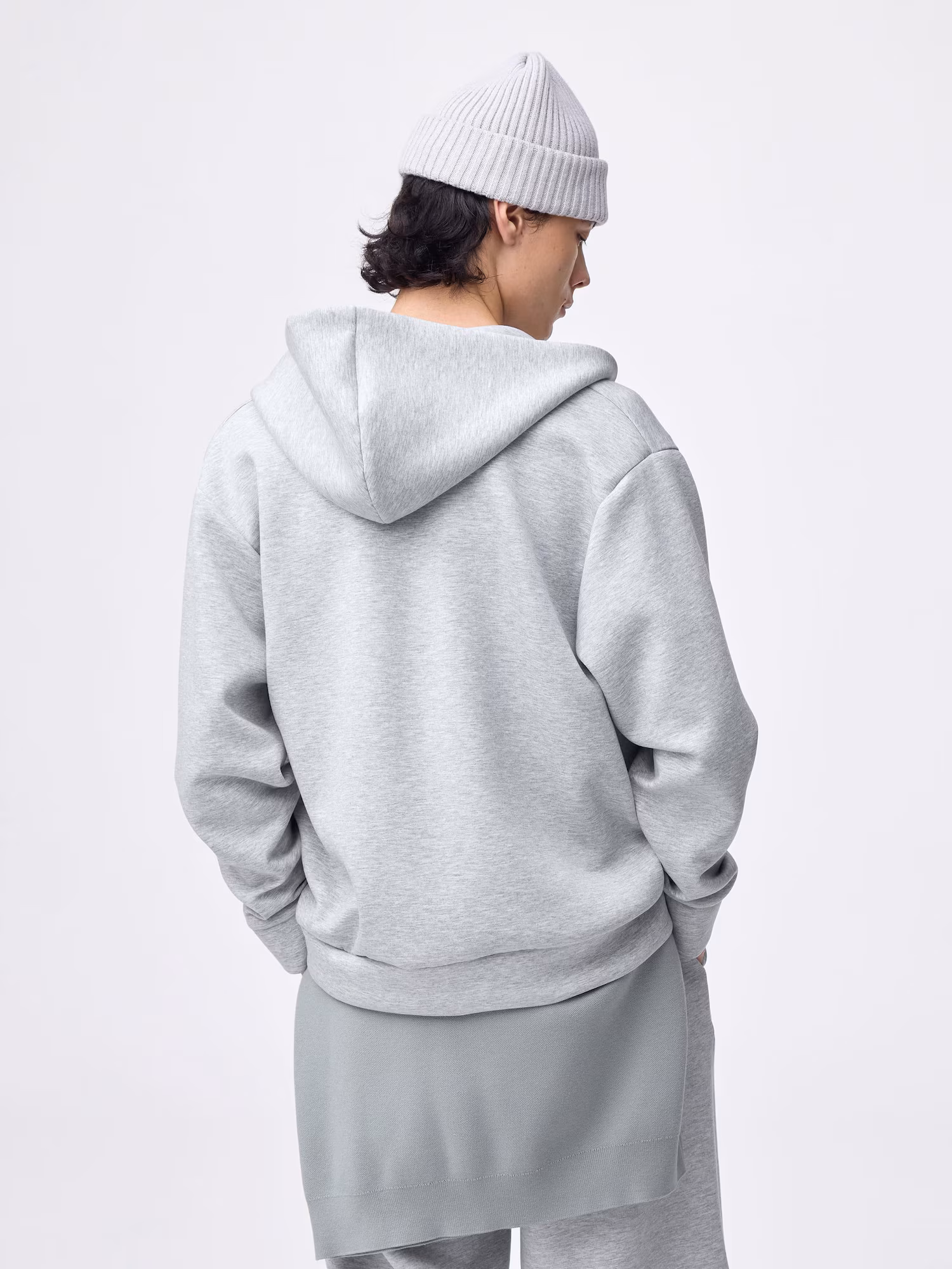無印良品の「紳士 スウェットフルジップパーカ」は、表は綿、裏は綿ポリエステルの裏起毛素材を使ったフルジップパーカーです。綿の柔らかな風合いを生かしながら肌触りが良く軽い着心地が特長で、洗濯後の乾きやすさもポイント。身幅に適度なゆとりを持たせることで、身体の線を拾いにくいフィット感のボックスシルエットに仕立てられています。また、フードは生地を二枚重ねにしており、中央に切り替えしの縫製を入れることで立ち上がりやすい立体的な仕様。一枚着としても、アウターのインとしても着まわしやすいアイテムです。