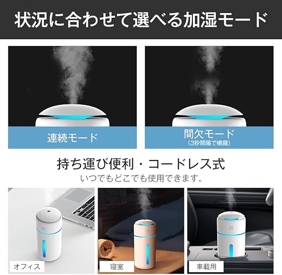 購入した人からは、「コンパクトでコードレス、どこへでも持っていけるので大変便利」「音は睡眠中でもまったく気になりません」「水の量が目視できるのがいい」「車用として使い始めました。ドリンクホルダーに入るので倒れたりしません。USBが付いてる車におすすめです」「転倒してもこぼれたりしないので、すごく安心しました」「こぼれないので持ち運びに便利でリビングや寝室で使っています」「場所を取らずに、狭い場所でも使いやすい。蒸気も細やかでいい」「LEDライトが綺麗でリラックスできます」「すごくしっかりした作りで、蒸気も十分すぎるくらい」「安い、オシャレ、水の入れ替え簡単、本当にこぼれない」「丸くおしゃれな形は、和室、洋室、どんなお部屋にも合うデザイン」「コスパ最高。スタイリッシュ。性能もしっかりしてます」といった声が寄せられています。