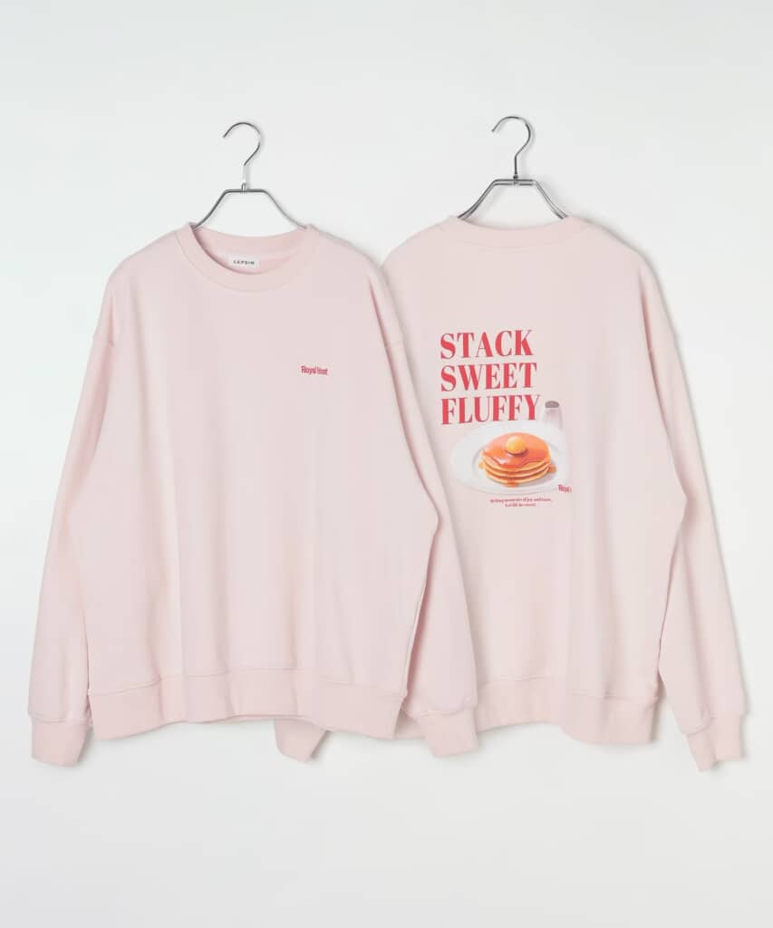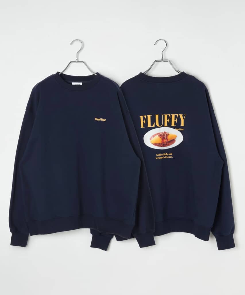 LEPSIMの「【Royal Host】フォトアソートスウェット」(税込5990円)は、ロイヤルホストとタッグを組んだコラボアイテムです。フロント左胸には小さめの「Royal Host」のロゴが入っており、バックには、厚みのあるパンケーキやオムライスなど、ロイヤルホストで親しまれてきた人気メニューのフォトプリントを大胆にレイアウトしています。