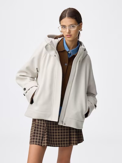 GUの「コージーメルトンショートフーディコート」は、ふくらみのあるニードルパンチ加工を施したやわらかなメルトン風素材を使ったショート丈のフーディコートです。今季モデル(商品番号357498)は、糸を十字断面糸に変更して光沢を抑えた生地にアップデートされており、より落ち着いた印象で着られます。立体的に立ち上がるフードとボリュームのあるネックデザインが顔まわりを華やかに見せてくれます。