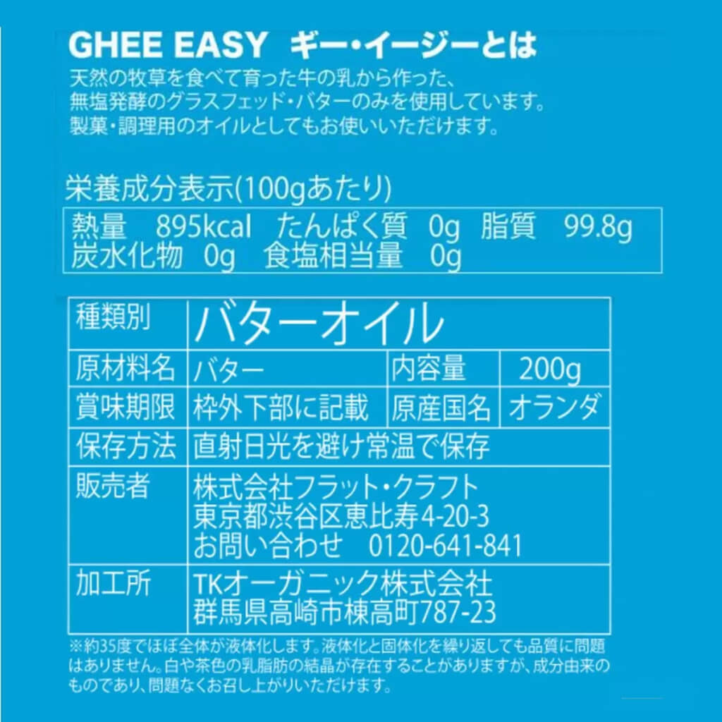 そんなコストコから「GHEE EASY グラスフェッド・ギー 200g」を見ていきましょう。天然牧草だけを食べて育った牛のミルクから作られたグラスフェッド・バターを原料とし、水分や乳固形分をしっかり取り除いて作られた、純度の高いバターオイル(ギー)です。共役リノール酸、中鎖脂肪酸、ビタミンA、E、酪酸(CLA)などの豊富な栄養素を含んでおり、また、香り・風味の豊かさで料理に彩を添えます。