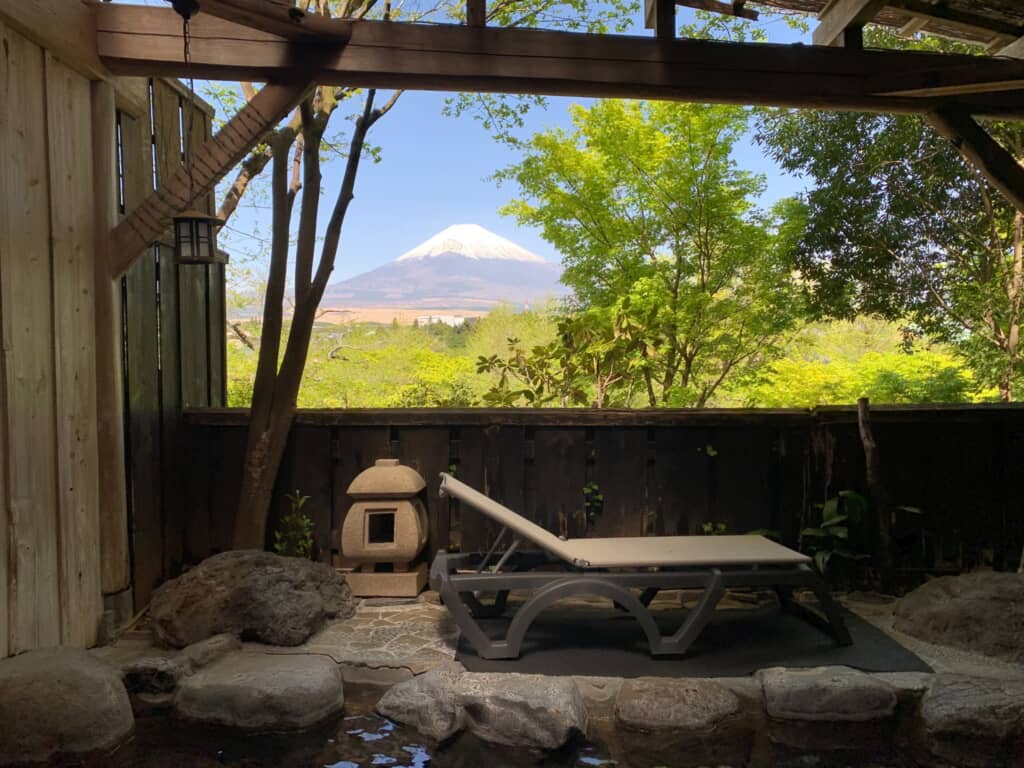 同ホテルは約10万坪の広々とした敷地に多彩な施設を備えたリゾートホテル。温浴施設「気楽坊」に直結しており、温泉やサウナが男女それぞれ7種用意されています。お風呂にはリラックス効果が得られるとされる炭酸泉や、香りの良い薬草泉の他、天気の良い日には富士山が見える露天風呂もあり、湯に浸かりながら富士山の姿を満喫できるのが人気の理由の一つかもしれません。