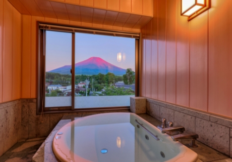 富士急ハイランドにも近く、キッズルームやランドリーを備えていることから家族連れにも人気。客室や部屋風呂から富士山が眺められる部屋も用意されており、誰にも邪魔されず景色を楽しむことができます。また、最上階には「富士山展望大浴場」もあり、眼前に広がる雄大な富士山を眺めながら入浴することができます。