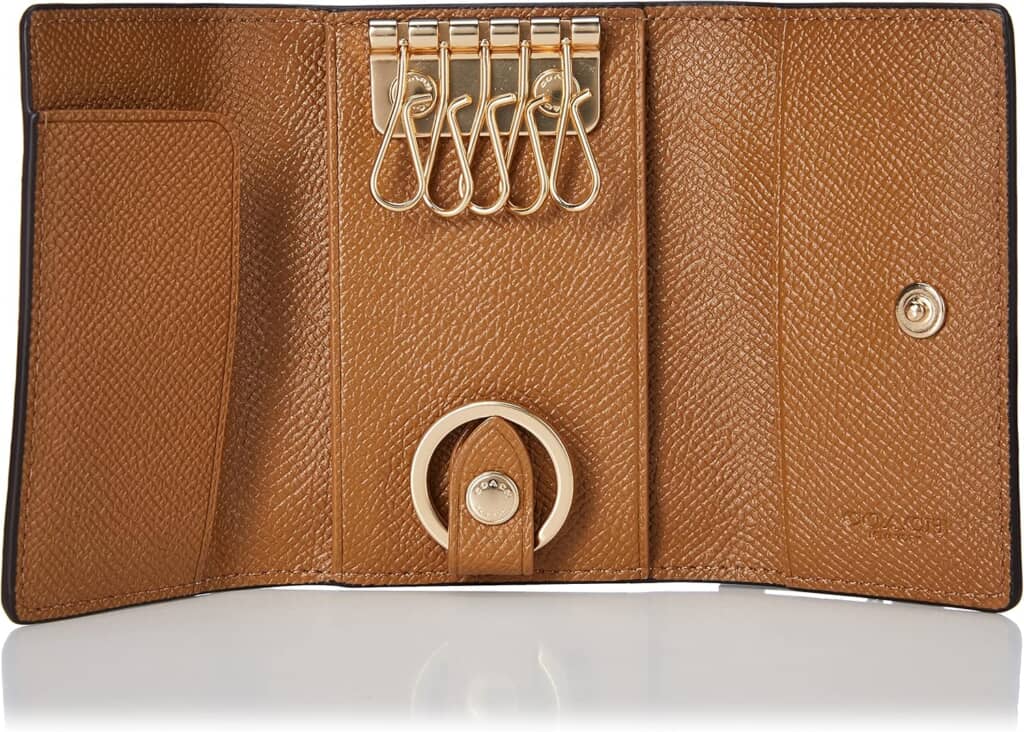 そんな「COACH」の「キーケース 76741」は、シンプルながら上品なデザインと実用性を兼ね備えたアイテム。内側にキー用フックが5本、加えて大きめのキーリングが1つ、さらに小さなオープンポケットが2つ備わっています。複数の鍵(家・車・オフィスなど)を整理しつつ、予備のキーホルダーや小さなアクセサリー類、カード類を持ち歩くことができます。