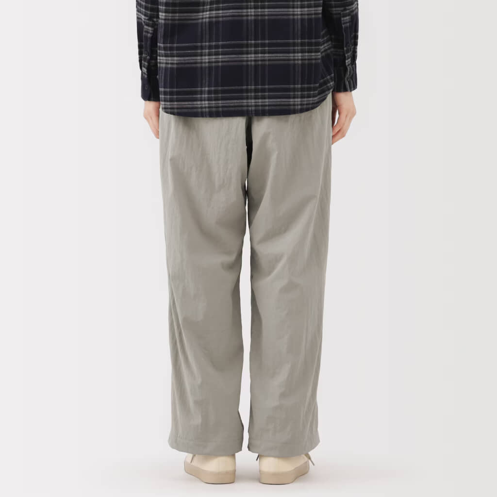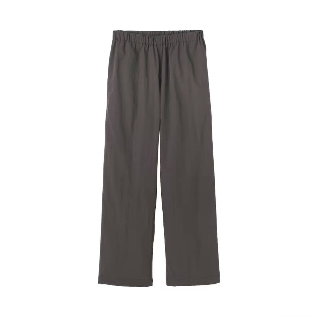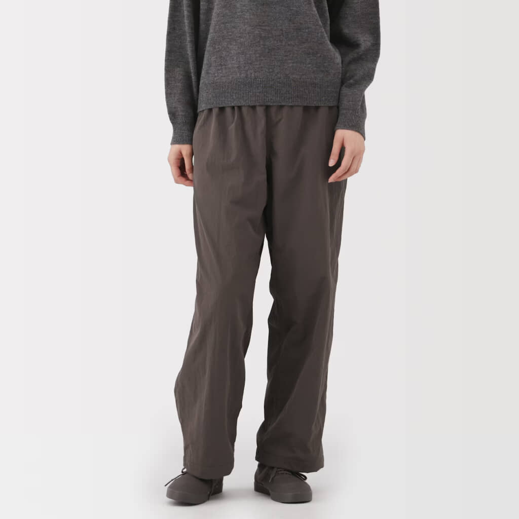 無印良品の「婦人 防風裏起毛 イージーパンツ」は、風を通しにくい表地と起毛素材の裏地を組み合わせた2枚仕立てで、軽さとあたたかさを両立した冬の定番ボトムです。表地のやわらかなナイロンには撥水加工を施し、シルエットは程よいゆとりを保ちながらもすっきり見えるストレートラインを採用。裾のドローコードでしぼれば足元からの冷気をブロックでき、股下のマチ形状を工夫して動きやすさにも配慮しています。