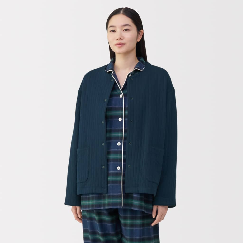 無印良品の「婦人 コットン混キルト カーディガン」(税込3990円)は、綿とポリエステルを組み合わせたコットン混素材に中わたを挟み、縦方向のキルティングを施した、ルームウェア感覚で羽織れるカーディガンです。綿にはオーガニックコットンを使用しており、やわらかなカットソー生地にふくらみのある構造を持たせることで、やや厚めながら軽さとあたたかさを両立しているのが特徴です。ノーカラーのすっきりした首元に、前立てや袖口、衿ぐりのパイピングがさりげないアクセントとなり、パジャマやルームウェアの上に羽織っても部屋着っぽく見えにくいデザインに仕上がっています。