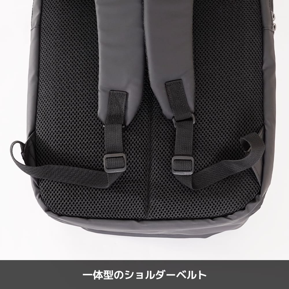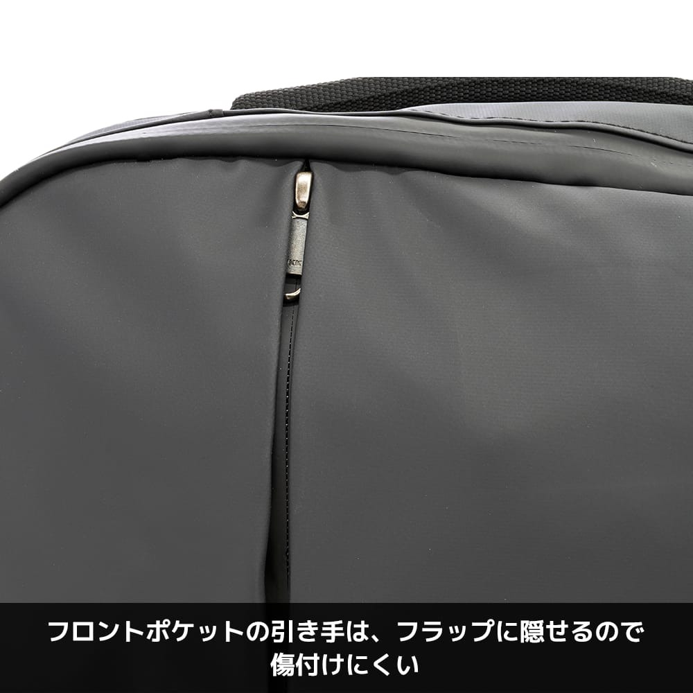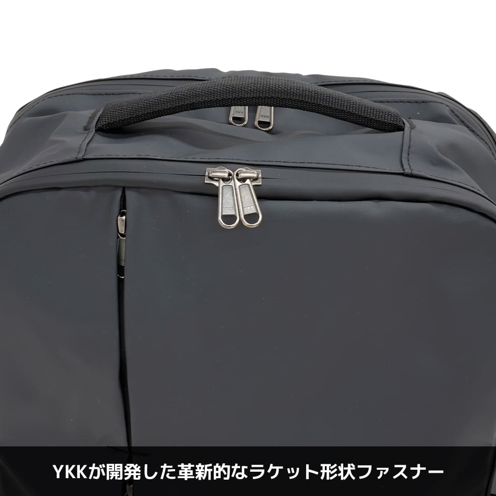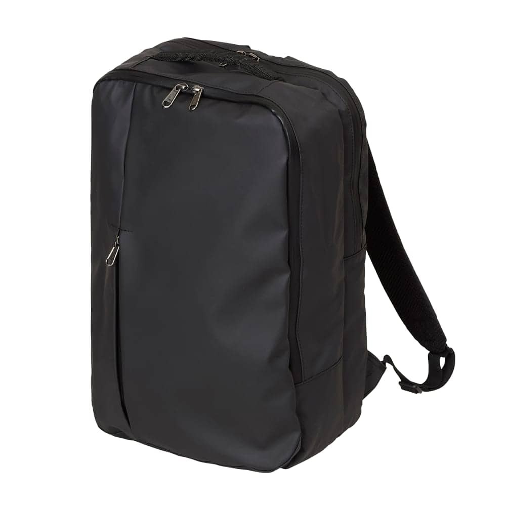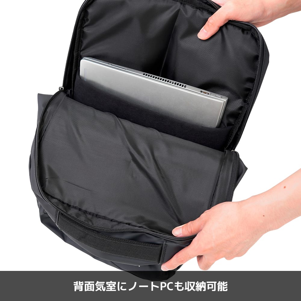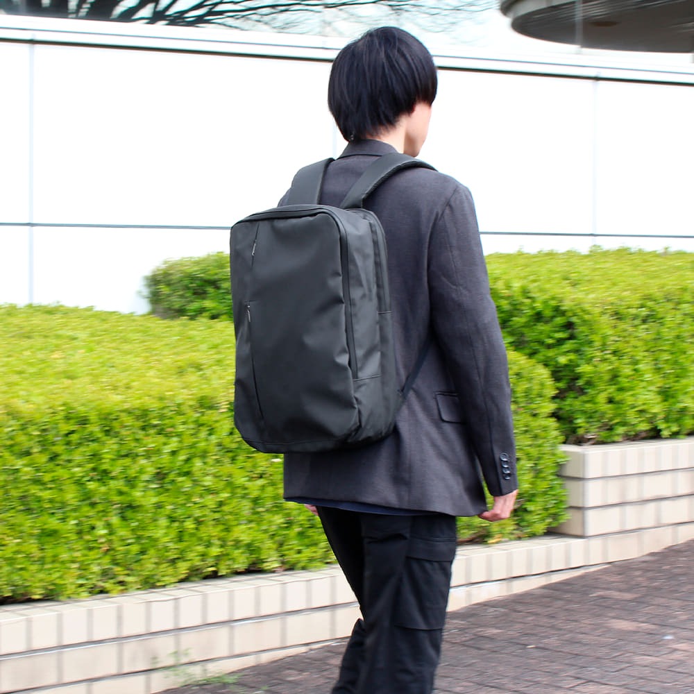 内部は2気室構造で、背面側にはPCスリーブ、前側にはファスナーポケットなどを配置し、フロントポケット2つとあわせて小物を整理しやすいレイアウトになっています。ファスナーの引き手をフラップ内に隠せる仕様は、壁や周囲の物を傷つけにくく見た目もすっきり。シンプルでプレーンなルックスはスーツにもカジュアルにも合わせやすく、性別や年代を問わず「毎日使える黒リュック」の本命候補と言えるでしょう。