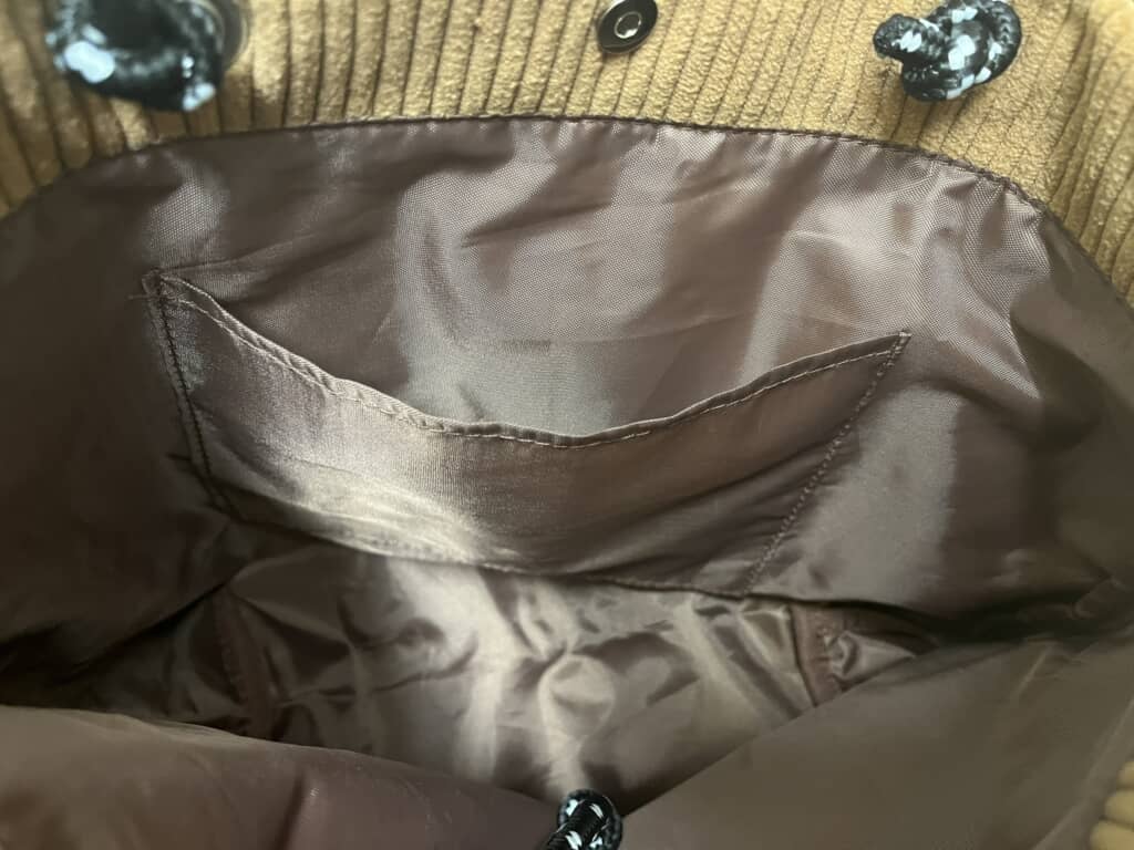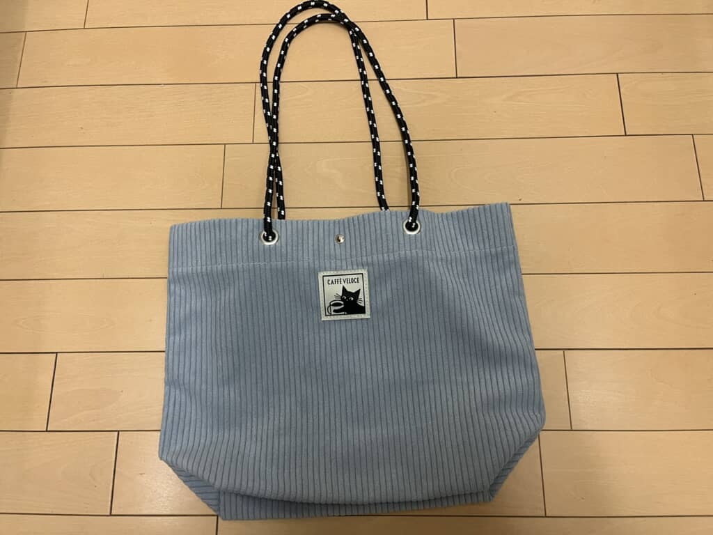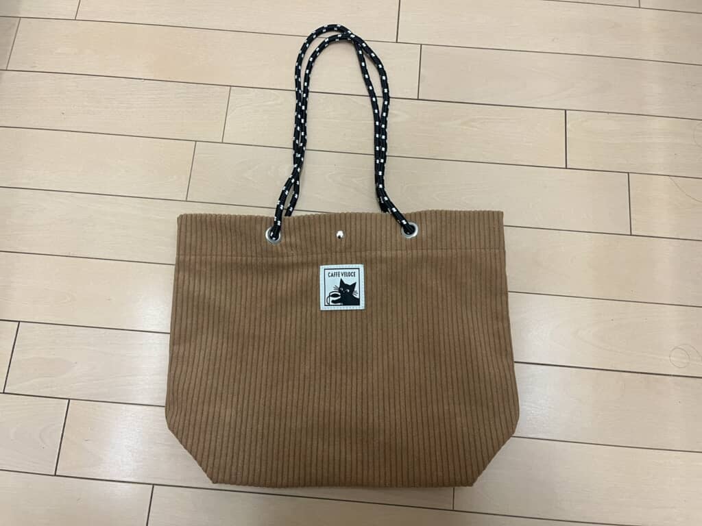 まず、福袋を開けた瞬間に、至るところにあるかわいらしい黒ねこのイラストに癒やされます。コーデュロイバッグは大きすぎず小さすぎずのちょうどよいサイズで、軽量ながら生地がしっかりしているため安っぽく見えません。持ち手は、手持ちも肩掛けもできる長さで使い勝手がよさそう。難点といえば、持ち手が丸い組紐のような形状なので、重いものを入れると肩に食い込みそうだなというぐらいでしょうか。ただ、サブバッグとして持つためなんの問題もありません。