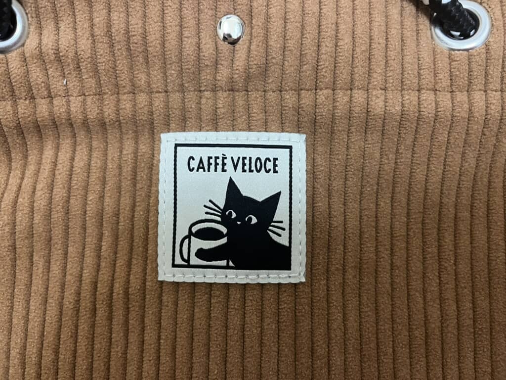 バッグは中央をボタンで留められるタイプで、中には小さなポケットがあるのもありがたい。表面にはベローチェのロゴとコーヒーを持った黒ねこがデザインされており、とにかくかわいいです。
